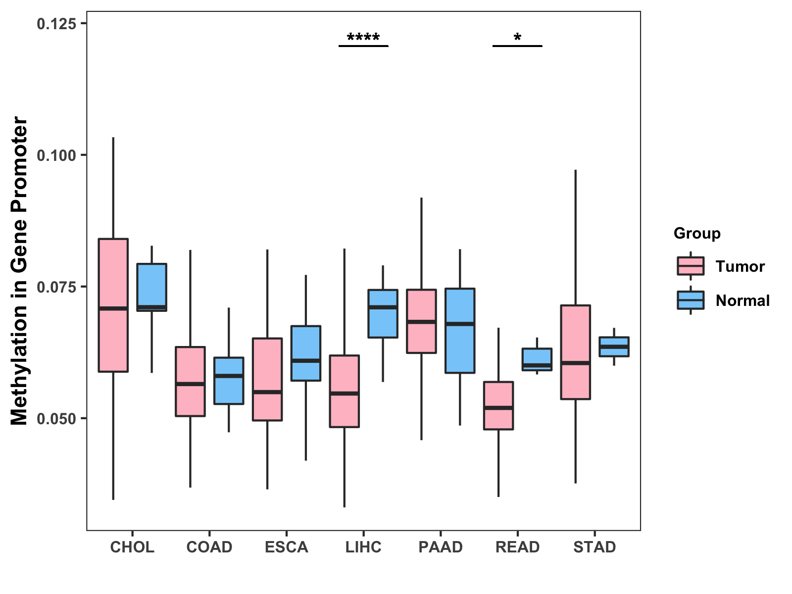 Boxplot of All Gastrointestinal Cancer ( * : 0.01-0.05 , ** : 0.005-0.01 , *** : 0.0001-0.005 , **** : < 0.0001 ) |