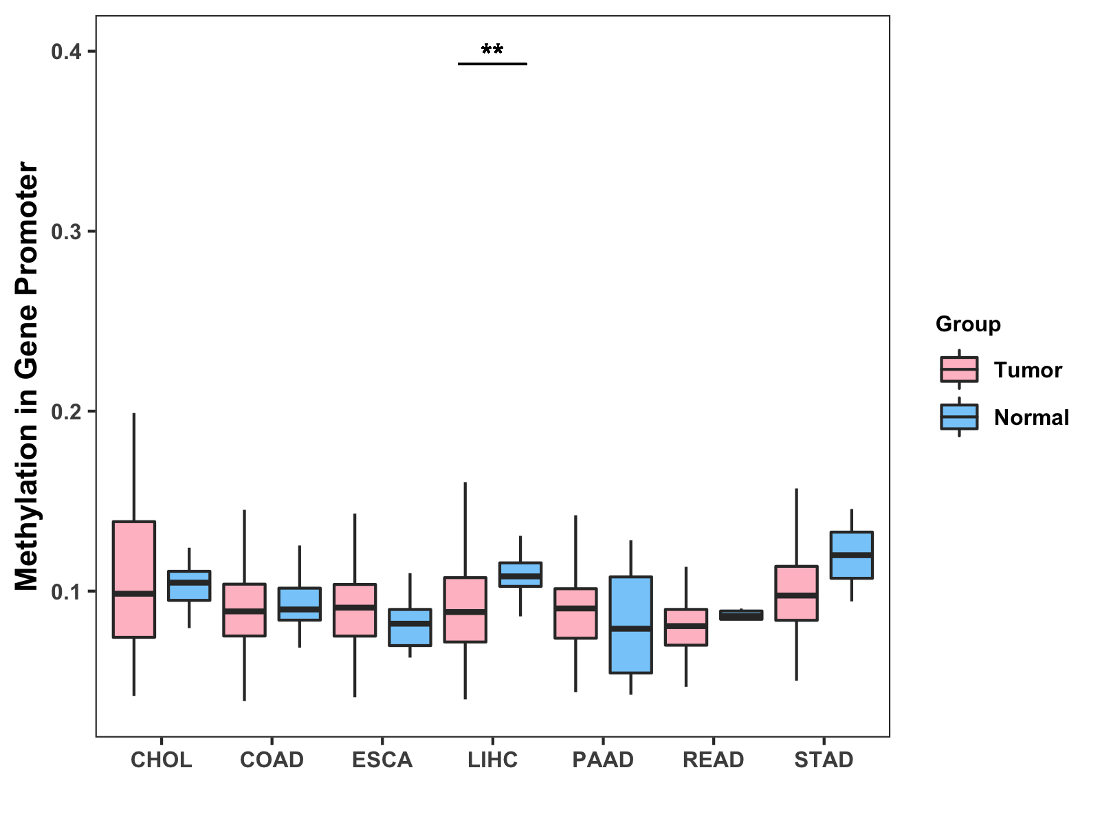 Boxplot of All Gastrointestinal Cancer ( * : 0.01-0.05 , ** : 0.005-0.01 , *** : 0.0001-0.005 , **** : < 0.0001 ) |