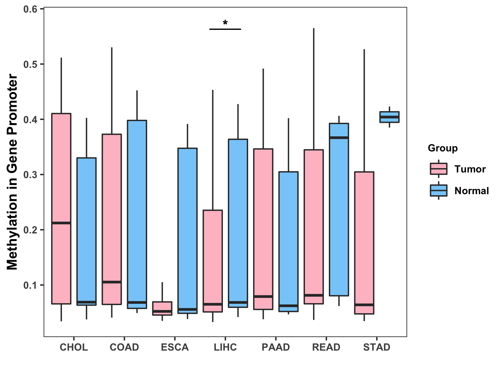Boxplot of All Gastrointestinal Cancer ( * : 0.01-0.05 , ** : 0.005-0.01 , *** : 0.0001-0.005 , **** : < 0.0001 ) |