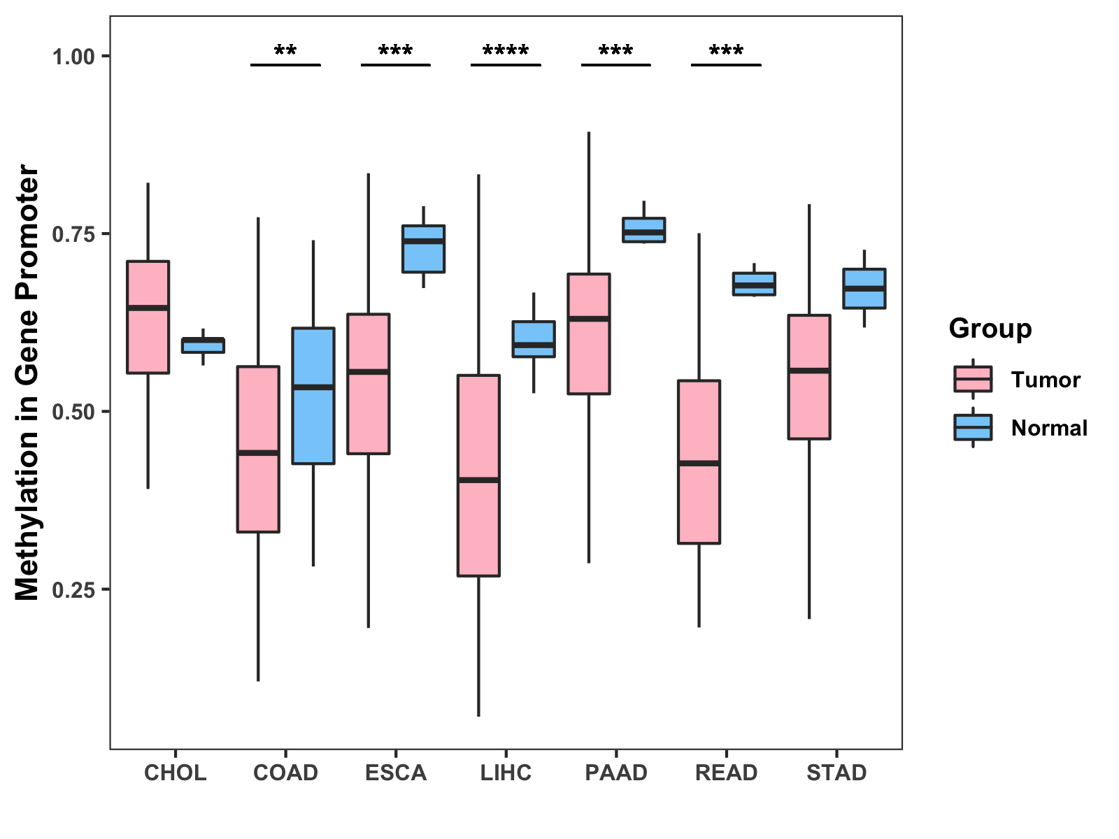 Boxplot of All Gastrointestinal Cancer ( * : 0.01-0.05 , ** : 0.005-0.01 , *** : 0.0001-0.005 , **** : < 0.0001 ) |