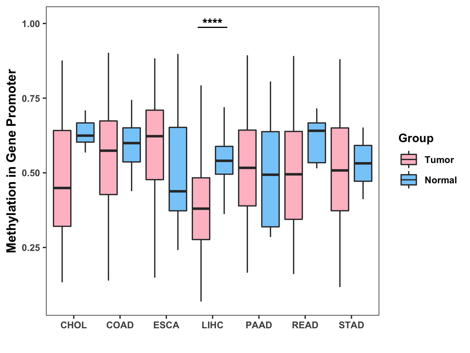 Boxplot of All Gastrointestinal Cancer ( * : 0.01-0.05 , ** : 0.005-0.01 , *** : 0.0001-0.005 , **** : < 0.0001 ) |