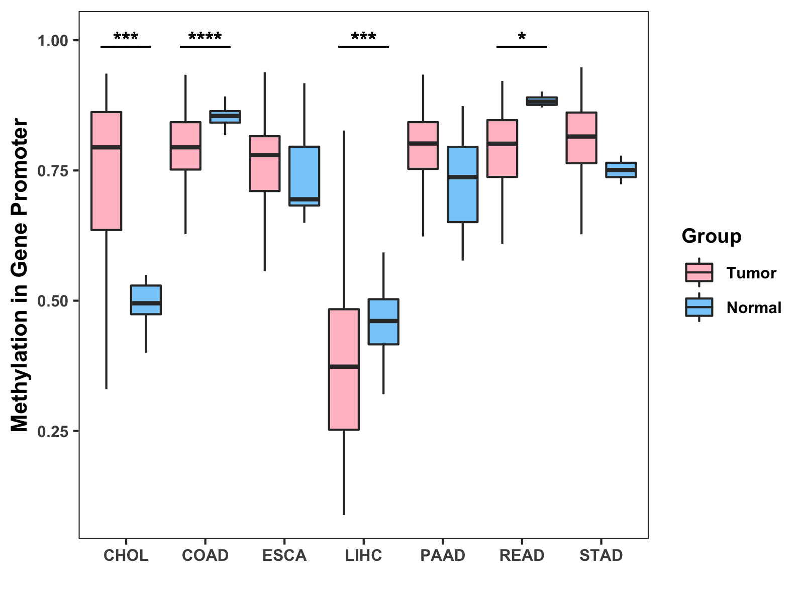 Boxplot of All Gastrointestinal Cancer ( * : 0.01-0.05 , ** : 0.005-0.01 , *** : 0.0001-0.005 , **** : < 0.0001 ) |