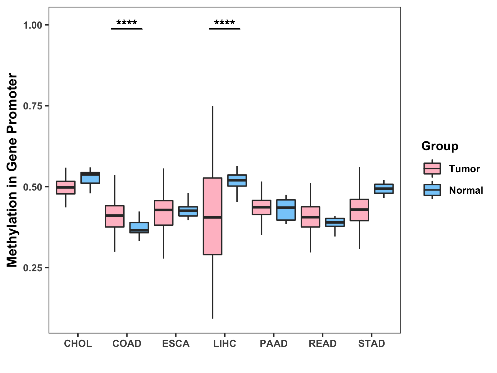 Boxplot of All Gastrointestinal Cancer ( * : 0.01-0.05 , ** : 0.005-0.01 , *** : 0.0001-0.005 , **** : < 0.0001 ) |