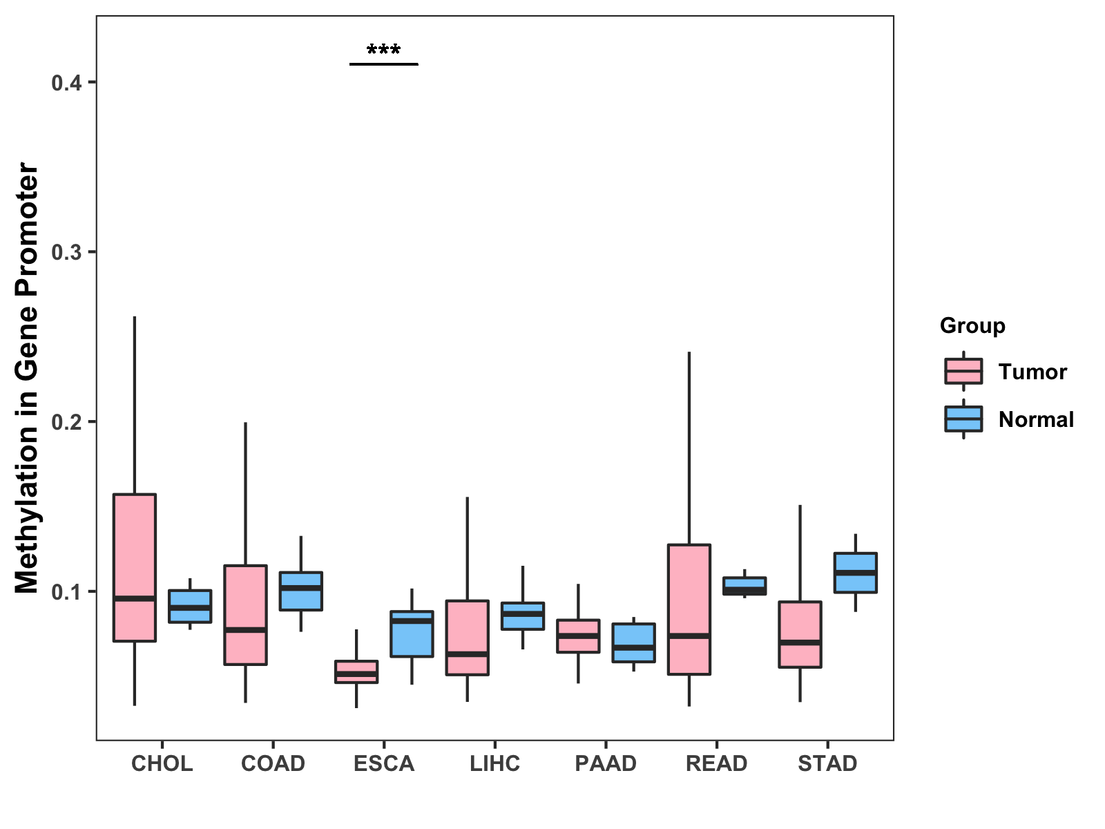 Boxplot of All Gastrointestinal Cancer ( * : 0.01-0.05 , ** : 0.005-0.01 , *** : 0.0001-0.005 , **** : < 0.0001 ) |