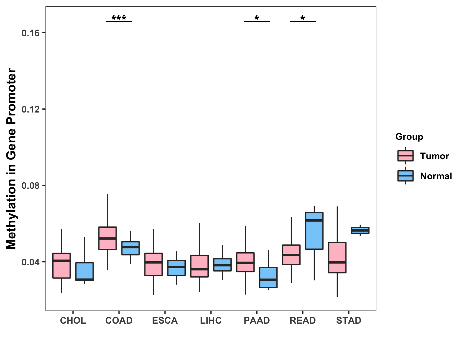 Boxplot of All Gastrointestinal Cancer ( * : 0.01-0.05 , ** : 0.005-0.01 , *** : 0.0001-0.005 , **** : < 0.0001 ) |