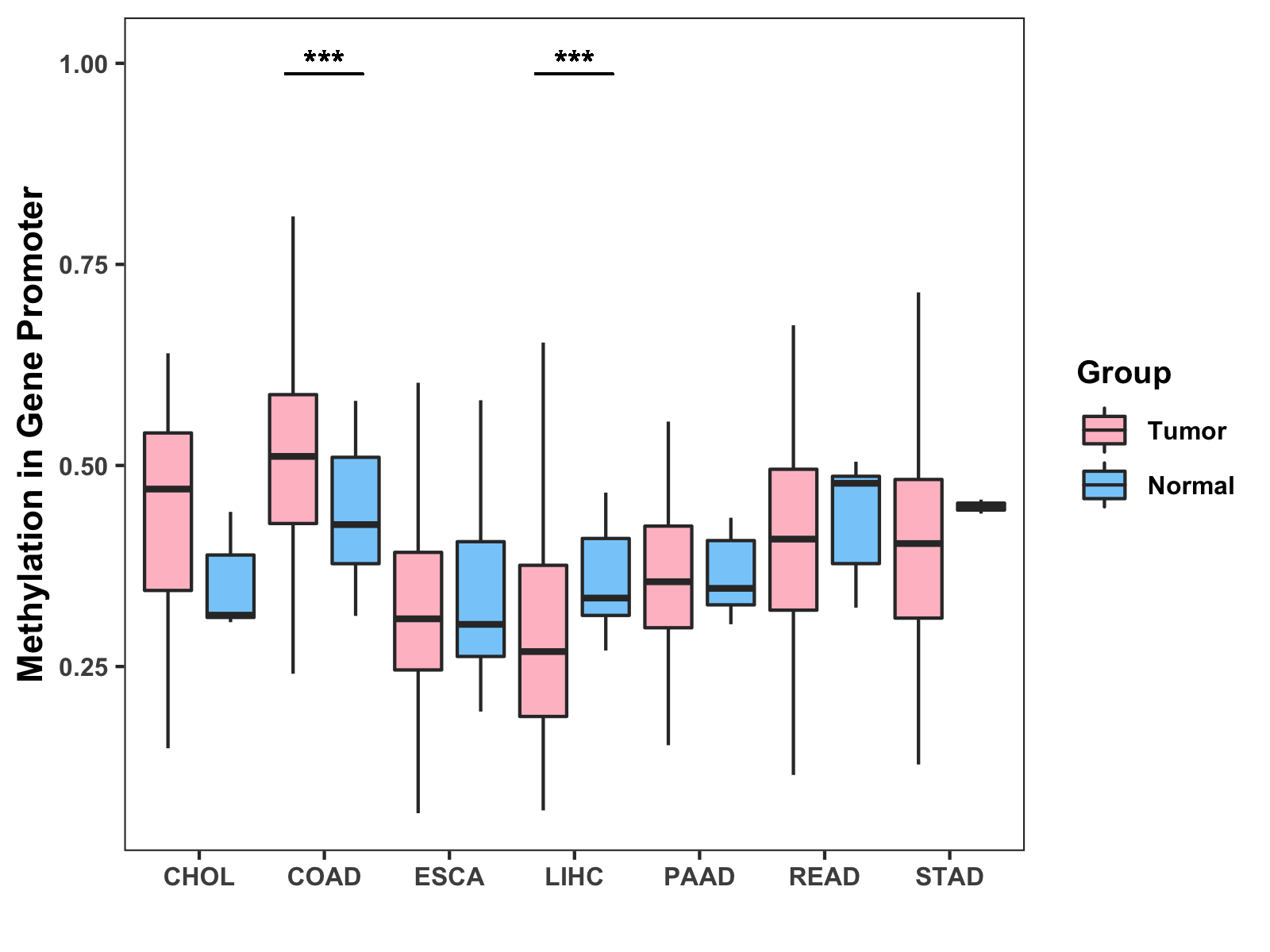 Boxplot of All Gastrointestinal Cancer ( * : 0.01-0.05 , ** : 0.005-0.01 , *** : 0.0001-0.005 , **** : < 0.0001 ) |