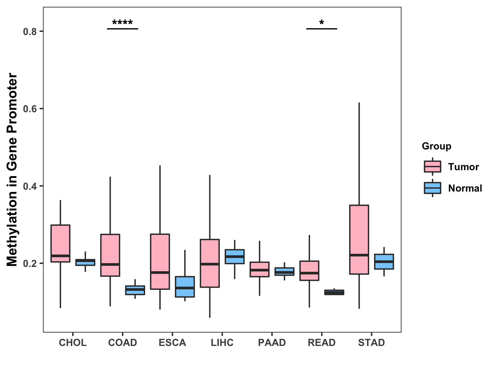 Boxplot of All Gastrointestinal Cancer ( * : 0.01-0.05 , ** : 0.005-0.01 , *** : 0.0001-0.005 , **** : < 0.0001 ) |