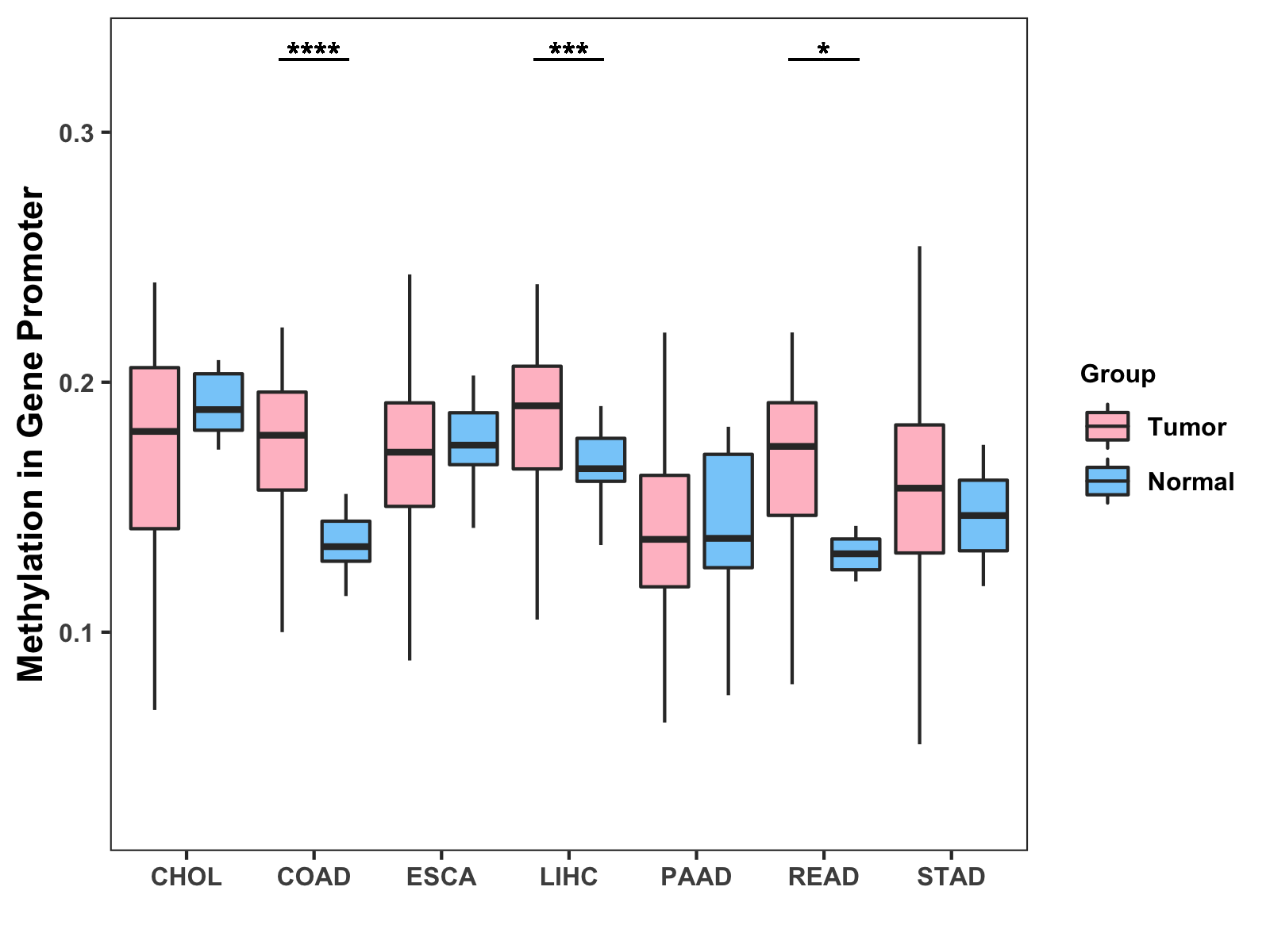 Boxplot of All Gastrointestinal Cancer ( * : 0.01-0.05 , ** : 0.005-0.01 , *** : 0.0001-0.005 , **** : < 0.0001 ) |
