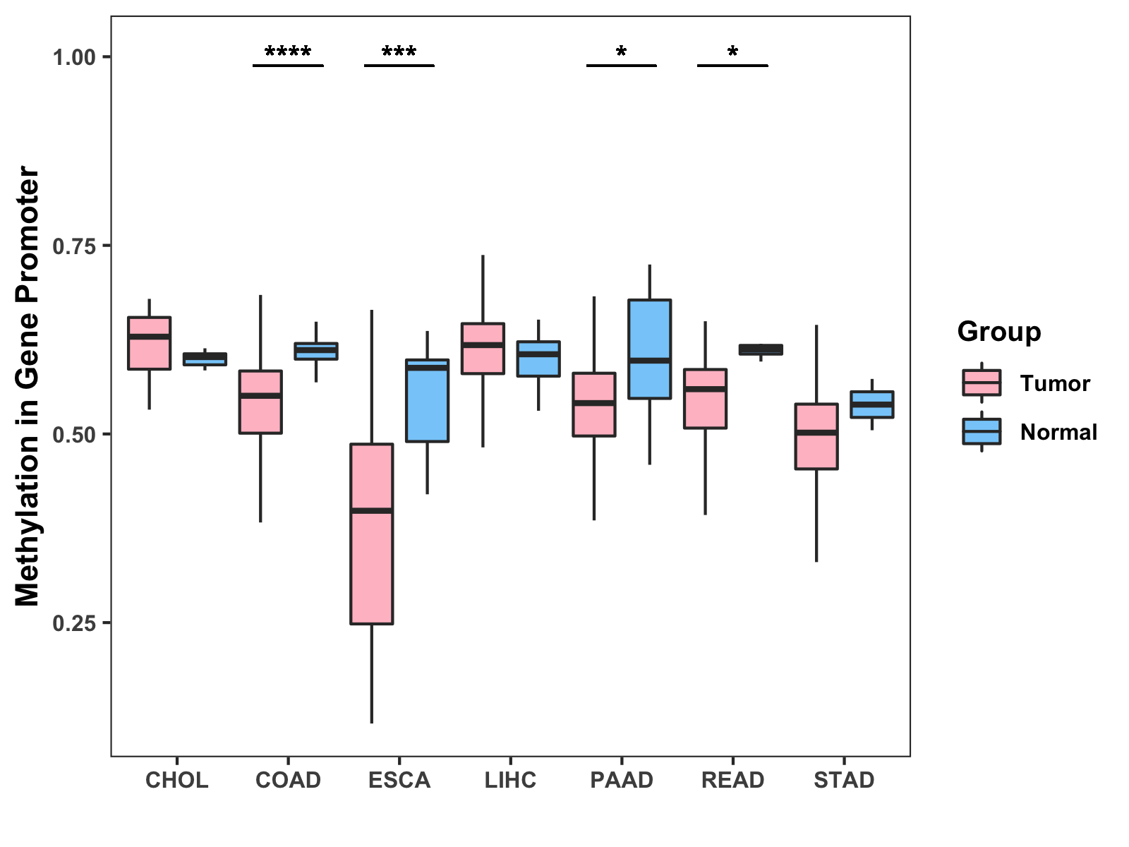 Boxplot of All Gastrointestinal Cancer ( * : 0.01-0.05 , ** : 0.005-0.01 , *** : 0.0001-0.005 , **** : < 0.0001 ) |