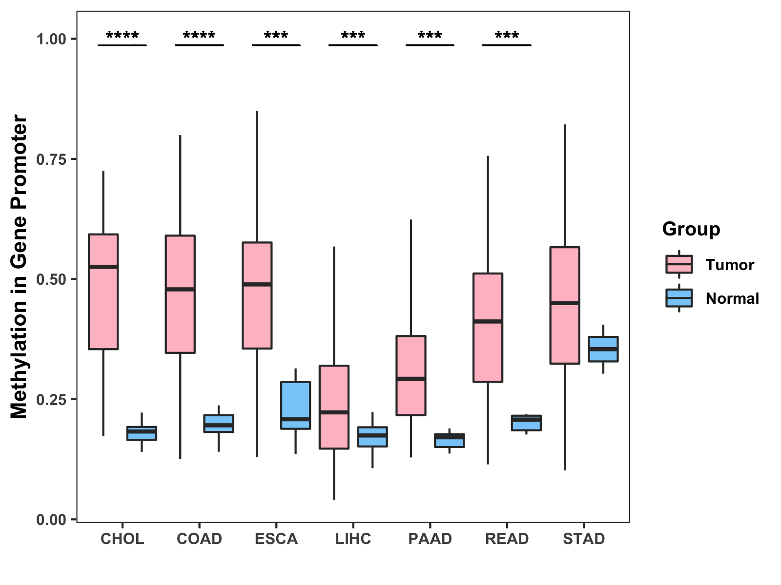 Boxplot of All Gastrointestinal Cancer ( * : 0.01-0.05 , ** : 0.005-0.01 , *** : 0.0001-0.005 , **** : < 0.0001 ) |