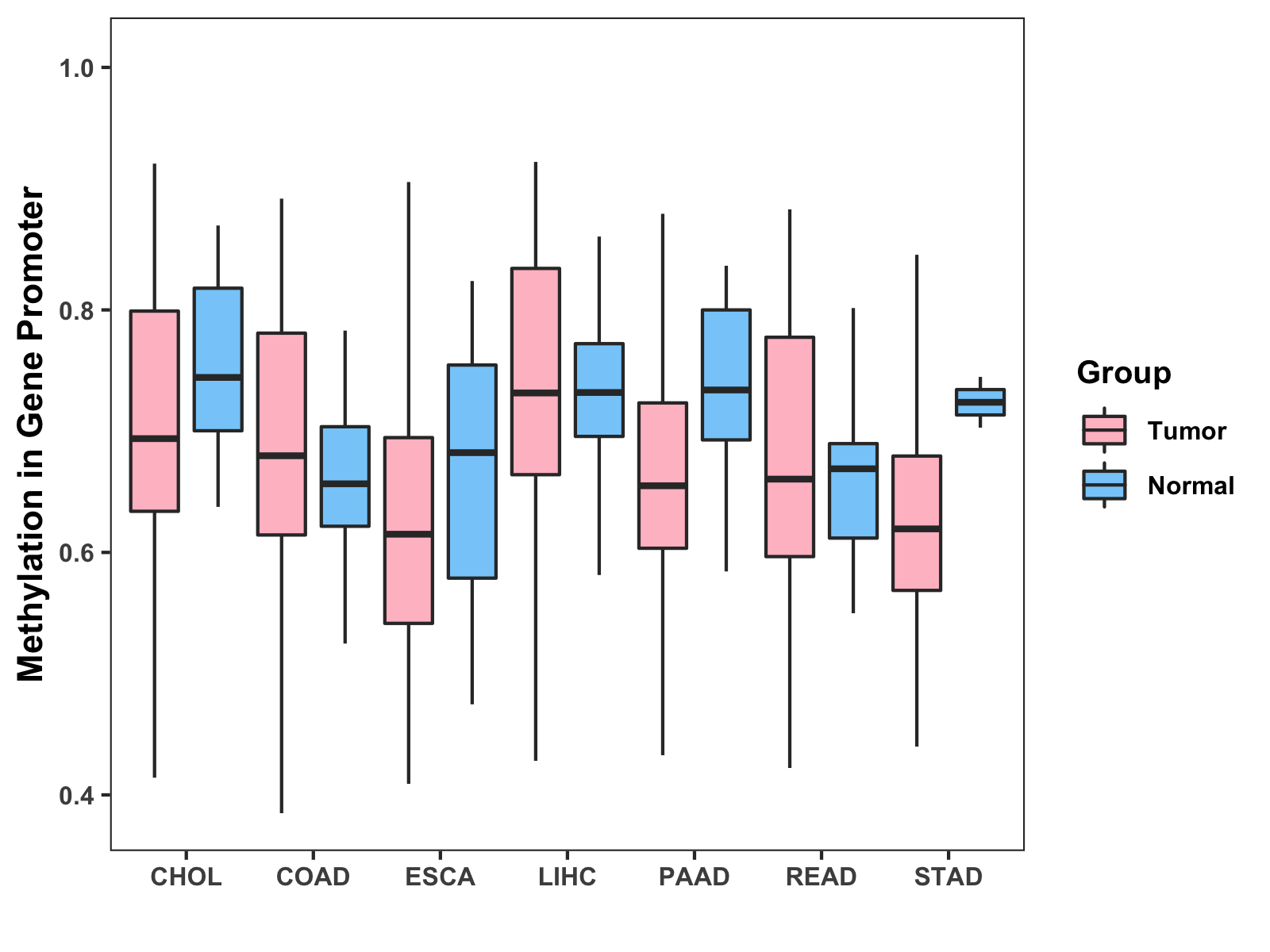 Boxplot of All Gastrointestinal Cancer ( * : 0.01-0.05 , ** : 0.005-0.01 , *** : 0.0001-0.005 , **** : < 0.0001 ) |