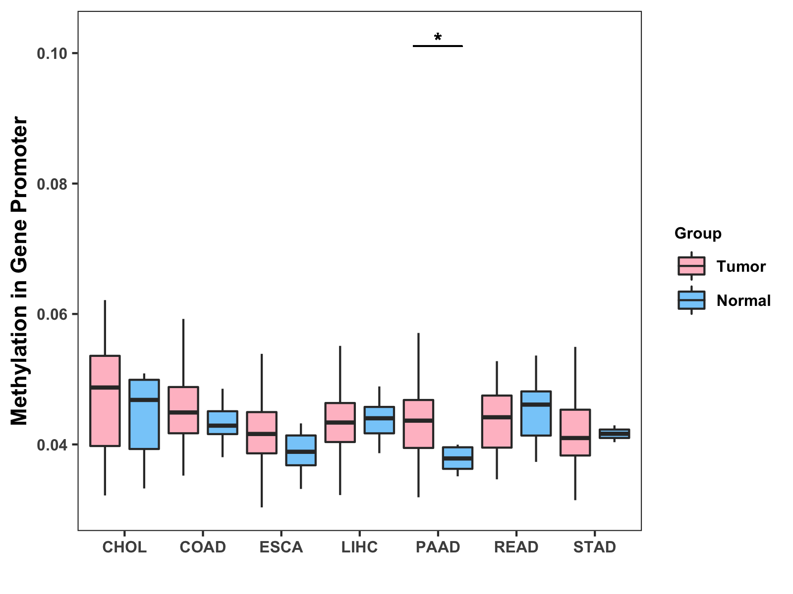 Boxplot of All Gastrointestinal Cancer ( * : 0.01-0.05 , ** : 0.005-0.01 , *** : 0.0001-0.005 , **** : < 0.0001 ) |