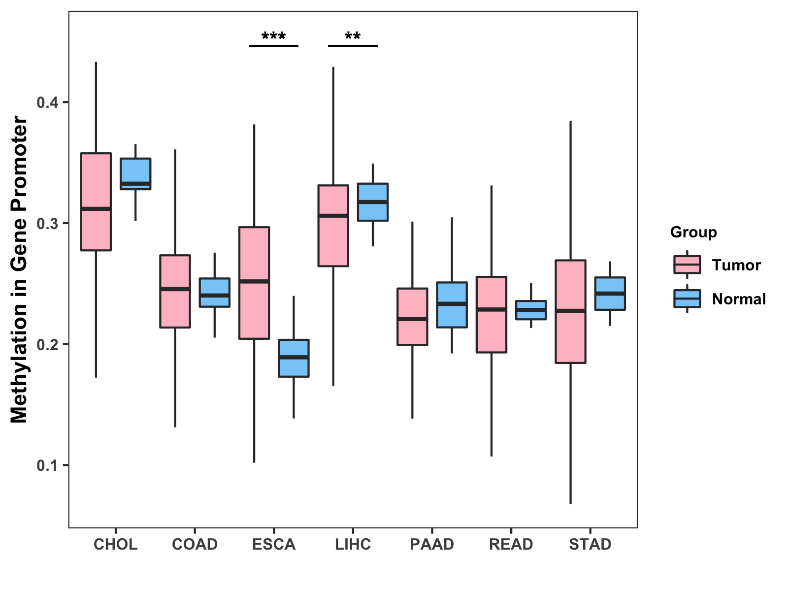 Boxplot of All Gastrointestinal Cancer ( * : 0.01-0.05 , ** : 0.005-0.01 , *** : 0.0001-0.005 , **** : < 0.0001 ) |