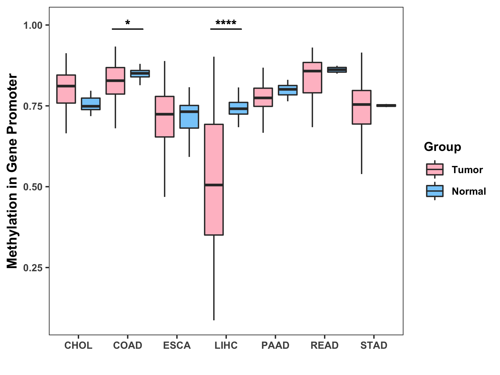 Boxplot of All Gastrointestinal Cancer ( * : 0.01-0.05 , ** : 0.005-0.01 , *** : 0.0001-0.005 , **** : < 0.0001 ) |