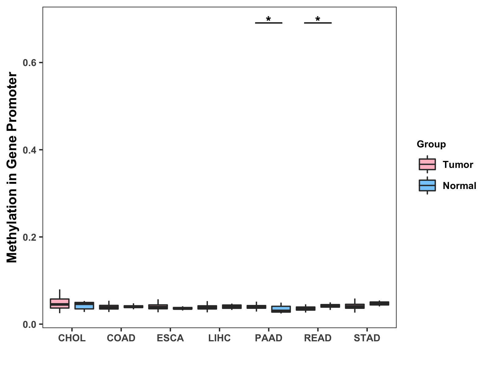 Boxplot of All Gastrointestinal Cancer ( * : 0.01-0.05 , ** : 0.005-0.01 , *** : 0.0001-0.005 , **** : < 0.0001 ) |
