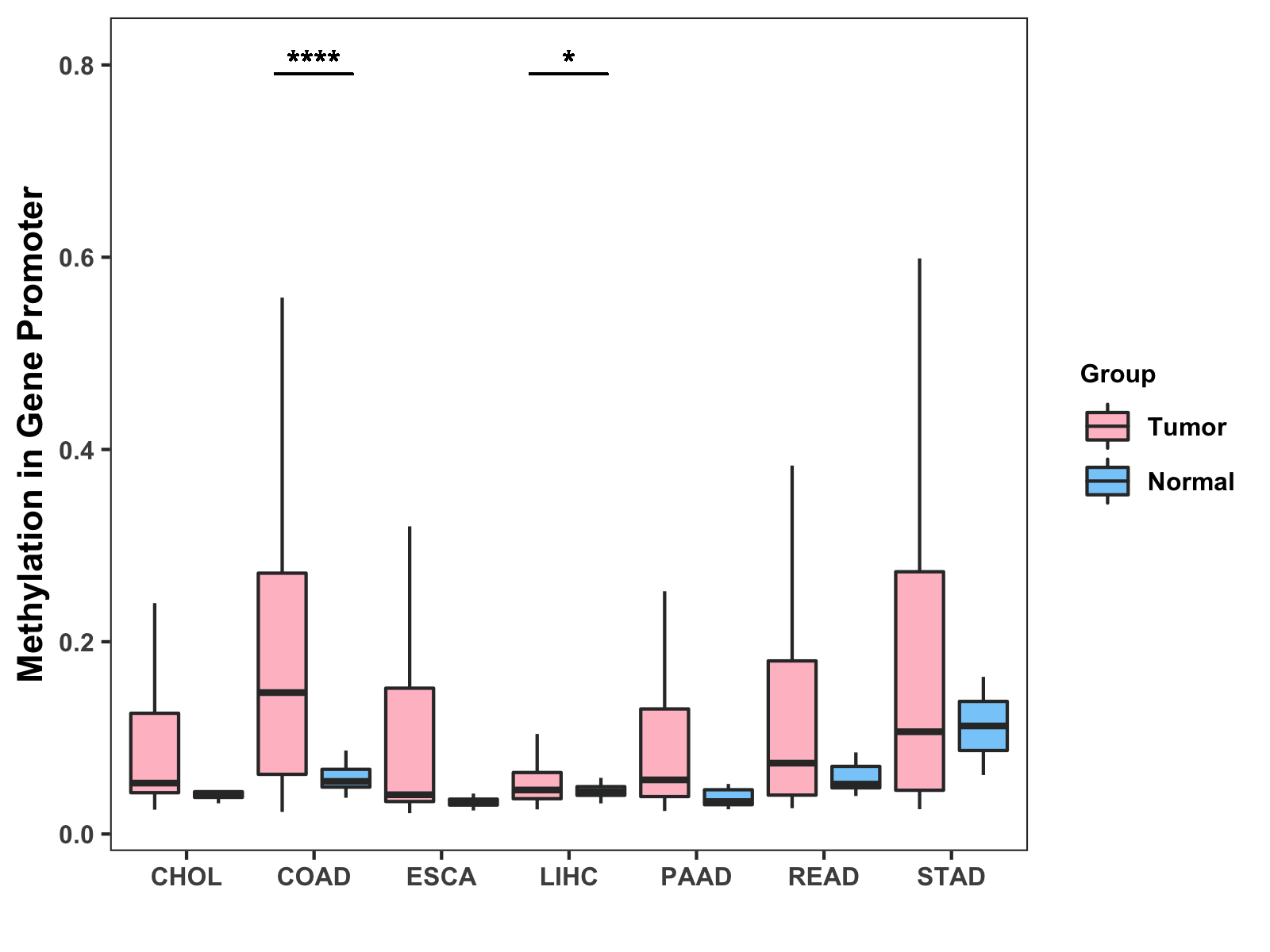 Boxplot of All Gastrointestinal Cancer ( * : 0.01-0.05 , ** : 0.005-0.01 , *** : 0.0001-0.005 , **** : < 0.0001 ) |