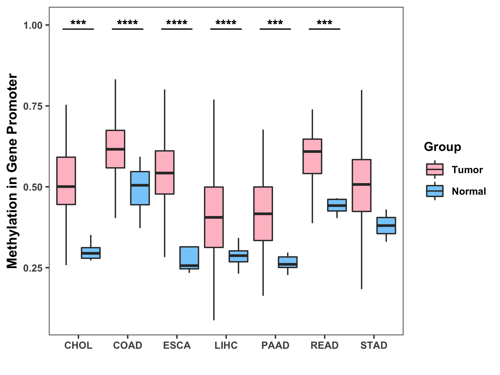 Boxplot of All Gastrointestinal Cancer ( * : 0.01-0.05 , ** : 0.005-0.01 , *** : 0.0001-0.005 , **** : < 0.0001 ) |
