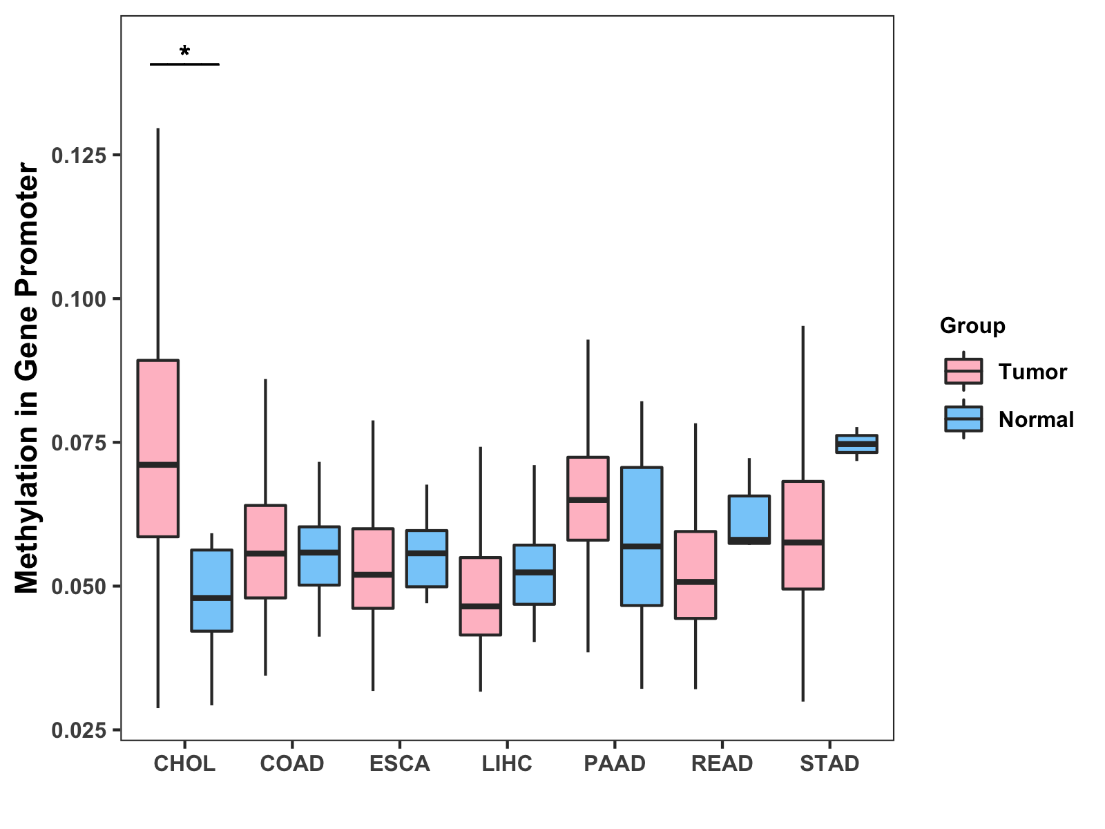 Boxplot of All Gastrointestinal Cancer ( * : 0.01-0.05 , ** : 0.005-0.01 , *** : 0.0001-0.005 , **** : < 0.0001 ) |