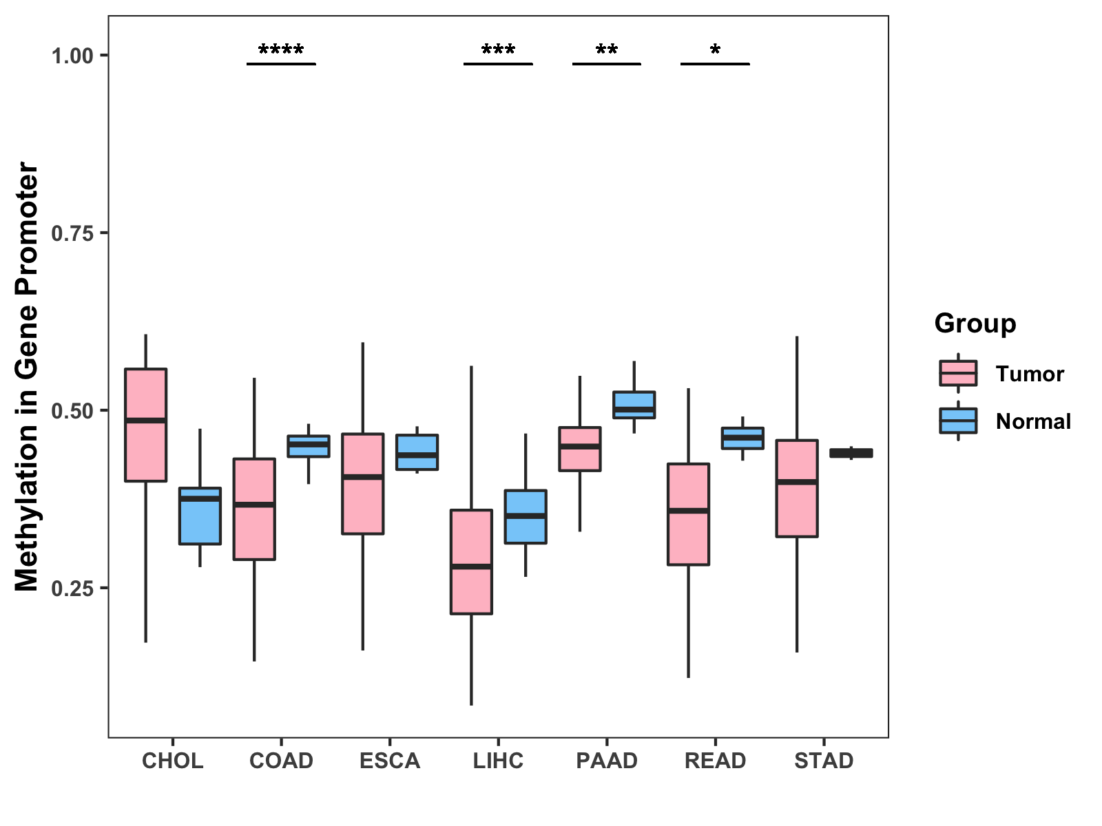Boxplot of All Gastrointestinal Cancer ( * : 0.01-0.05 , ** : 0.005-0.01 , *** : 0.0001-0.005 , **** : < 0.0001 ) |