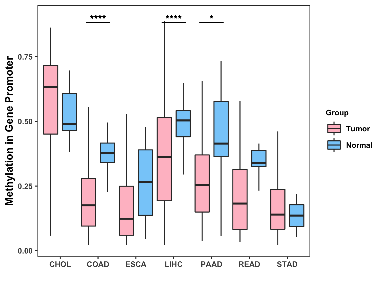 Boxplot of All Gastrointestinal Cancer ( * : 0.01-0.05 , ** : 0.005-0.01 , *** : 0.0001-0.005 , **** : < 0.0001 ) |