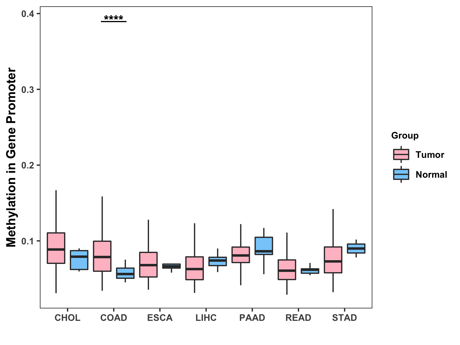 Boxplot of All Gastrointestinal Cancer ( * : 0.01-0.05 , ** : 0.005-0.01 , *** : 0.0001-0.005 , **** : < 0.0001 ) |