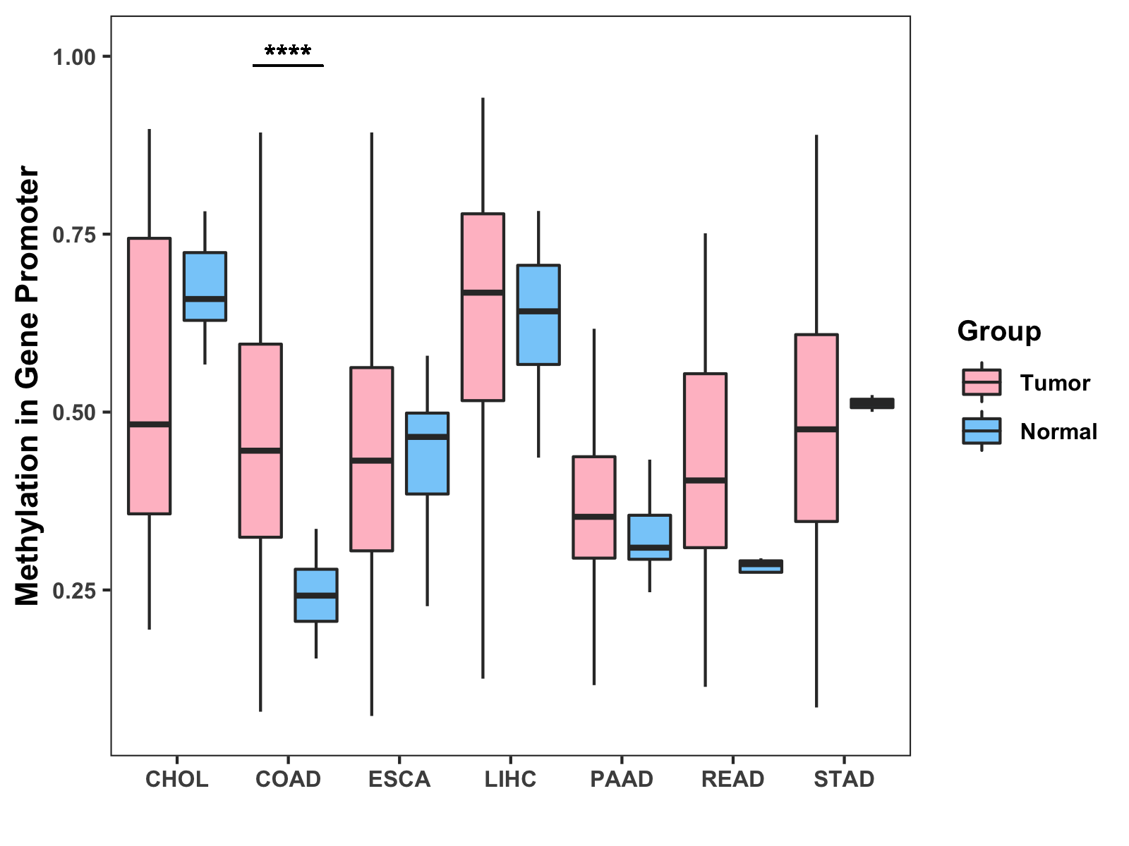 Boxplot of All Gastrointestinal Cancer ( * : 0.01-0.05 , ** : 0.005-0.01 , *** : 0.0001-0.005 , **** : < 0.0001 ) |