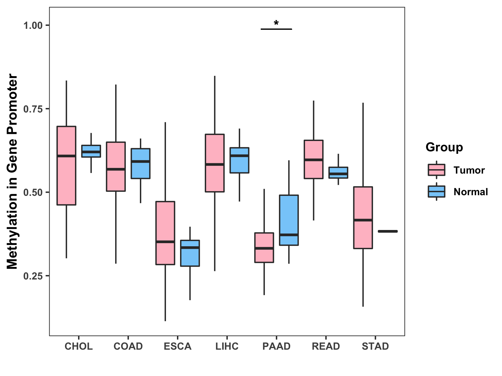 Boxplot of All Gastrointestinal Cancer ( * : 0.01-0.05 , ** : 0.005-0.01 , *** : 0.0001-0.005 , **** : < 0.0001 ) |