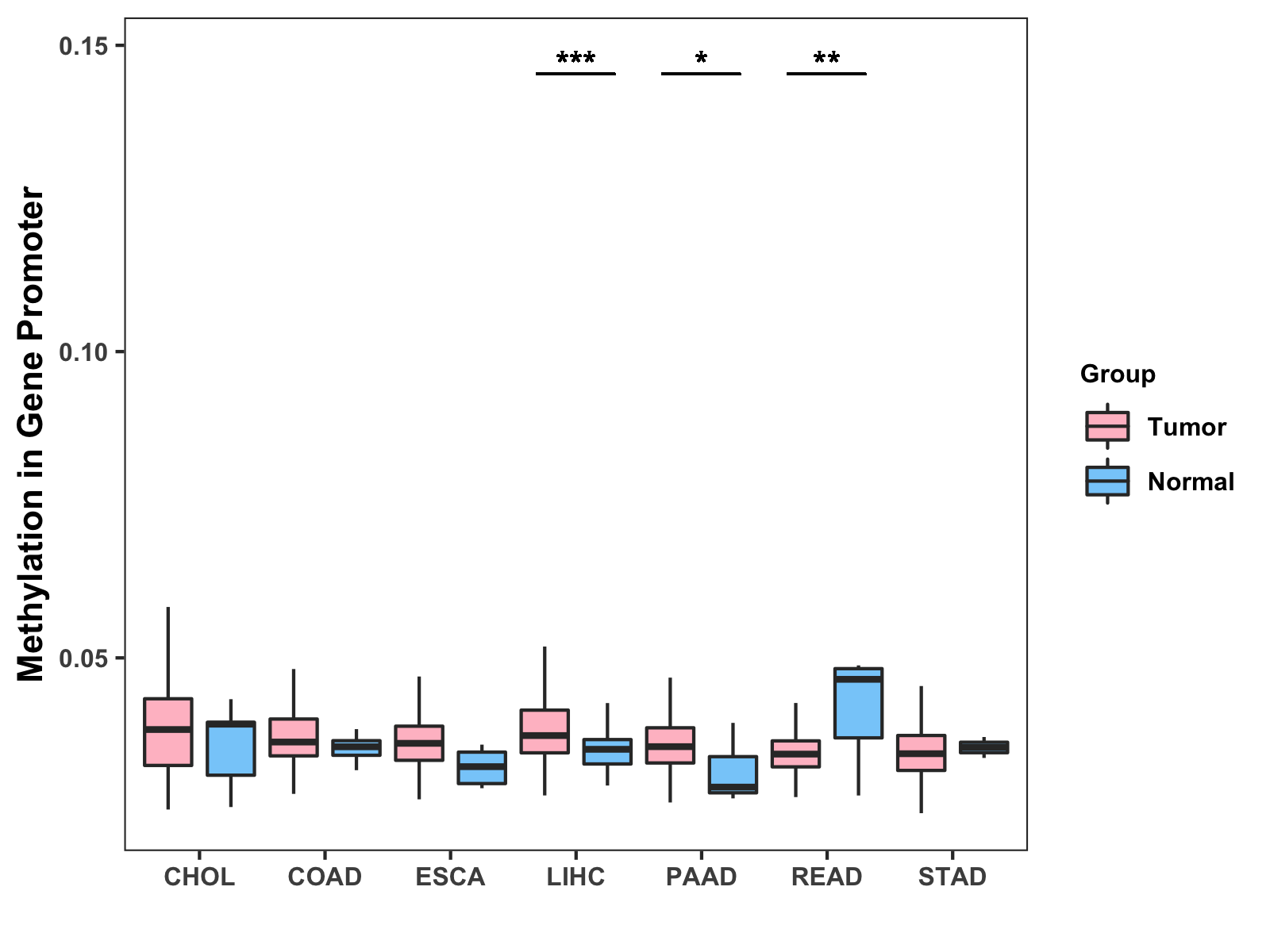 Boxplot of All Gastrointestinal Cancer ( * : 0.01-0.05 , ** : 0.005-0.01 , *** : 0.0001-0.005 , **** : < 0.0001 ) |