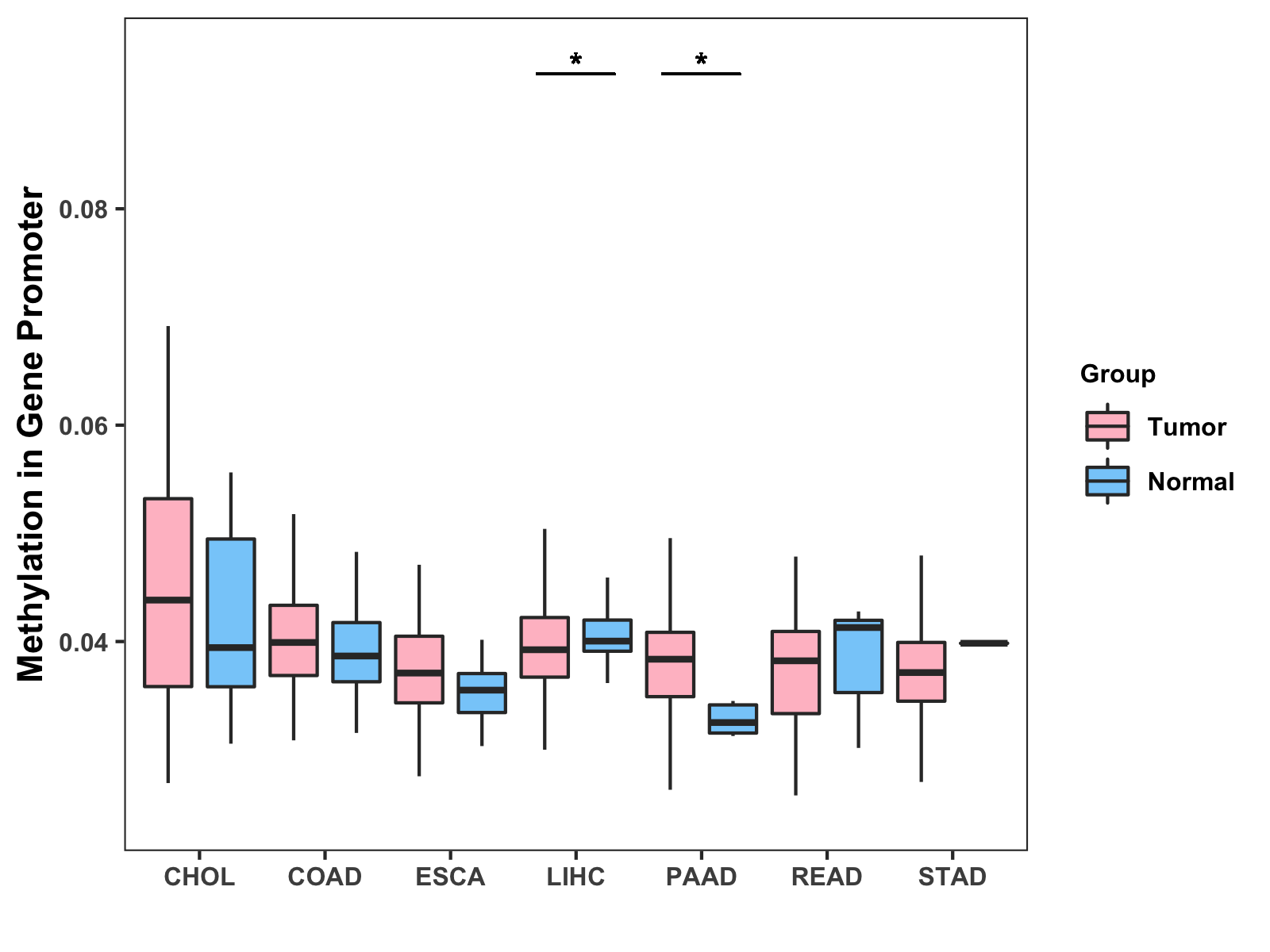 Boxplot of All Gastrointestinal Cancer ( * : 0.01-0.05 , ** : 0.005-0.01 , *** : 0.0001-0.005 , **** : < 0.0001 ) |