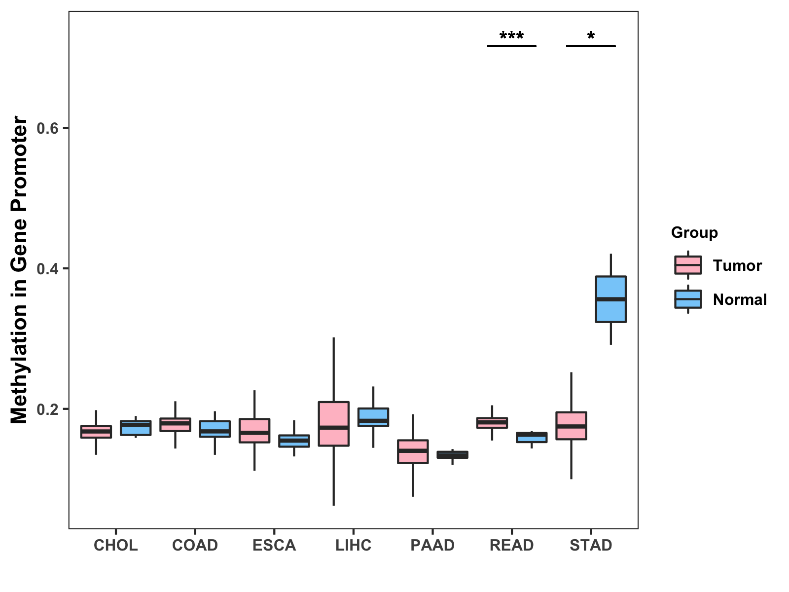 Boxplot of All Gastrointestinal Cancer ( * : 0.01-0.05 , ** : 0.005-0.01 , *** : 0.0001-0.005 , **** : < 0.0001 ) |