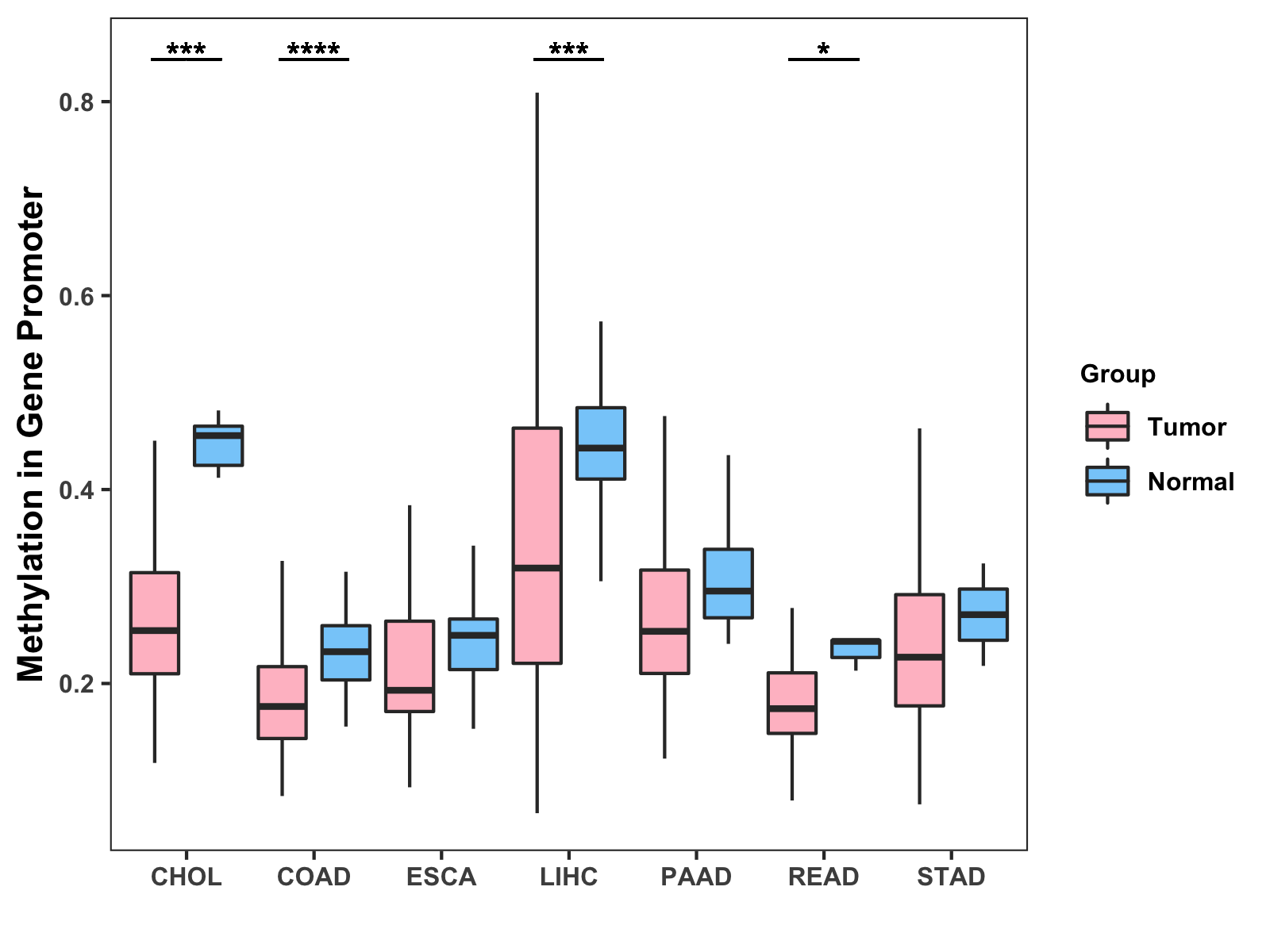 Boxplot of All Gastrointestinal Cancer ( * : 0.01-0.05 , ** : 0.005-0.01 , *** : 0.0001-0.005 , **** : < 0.0001 ) |