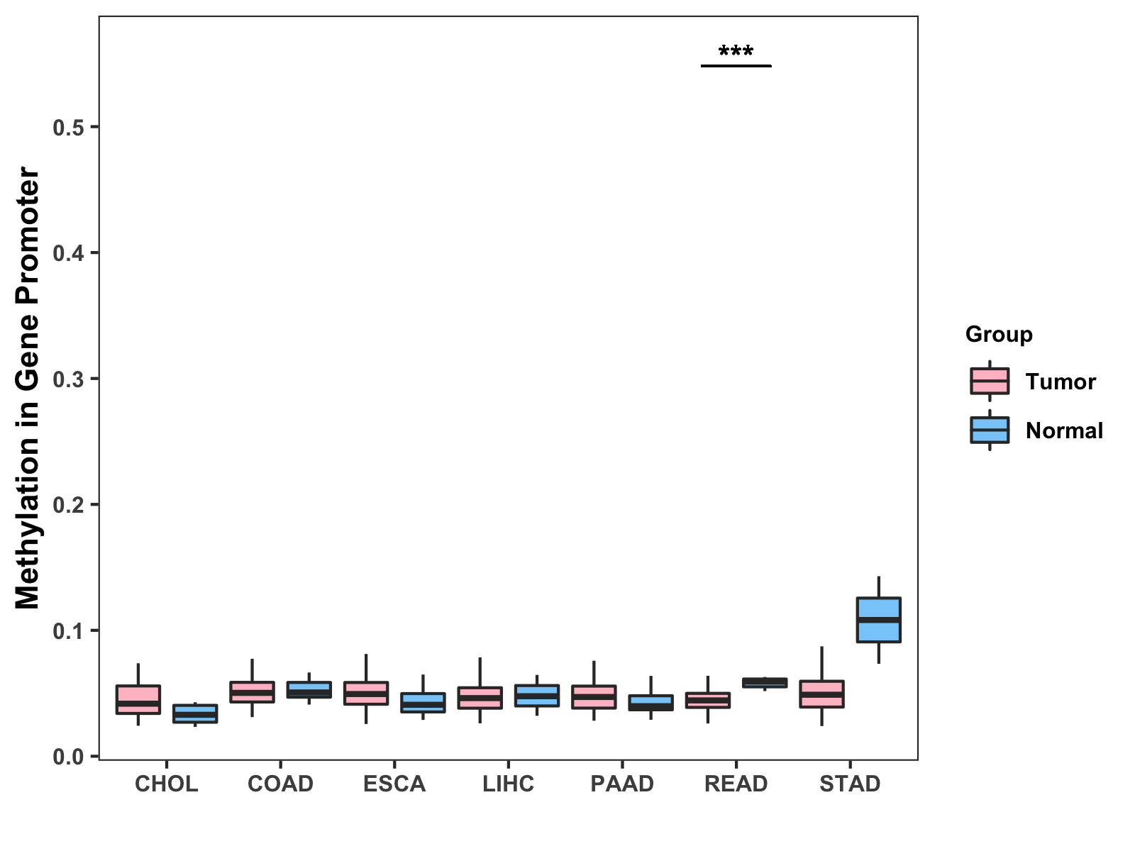 Boxplot of All Gastrointestinal Cancer ( * : 0.01-0.05 , ** : 0.005-0.01 , *** : 0.0001-0.005 , **** : < 0.0001 ) |