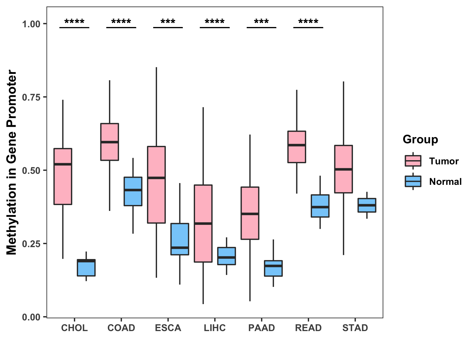 Boxplot of All Gastrointestinal Cancer ( * : 0.01-0.05 , ** : 0.005-0.01 , *** : 0.0001-0.005 , **** : < 0.0001 ) |