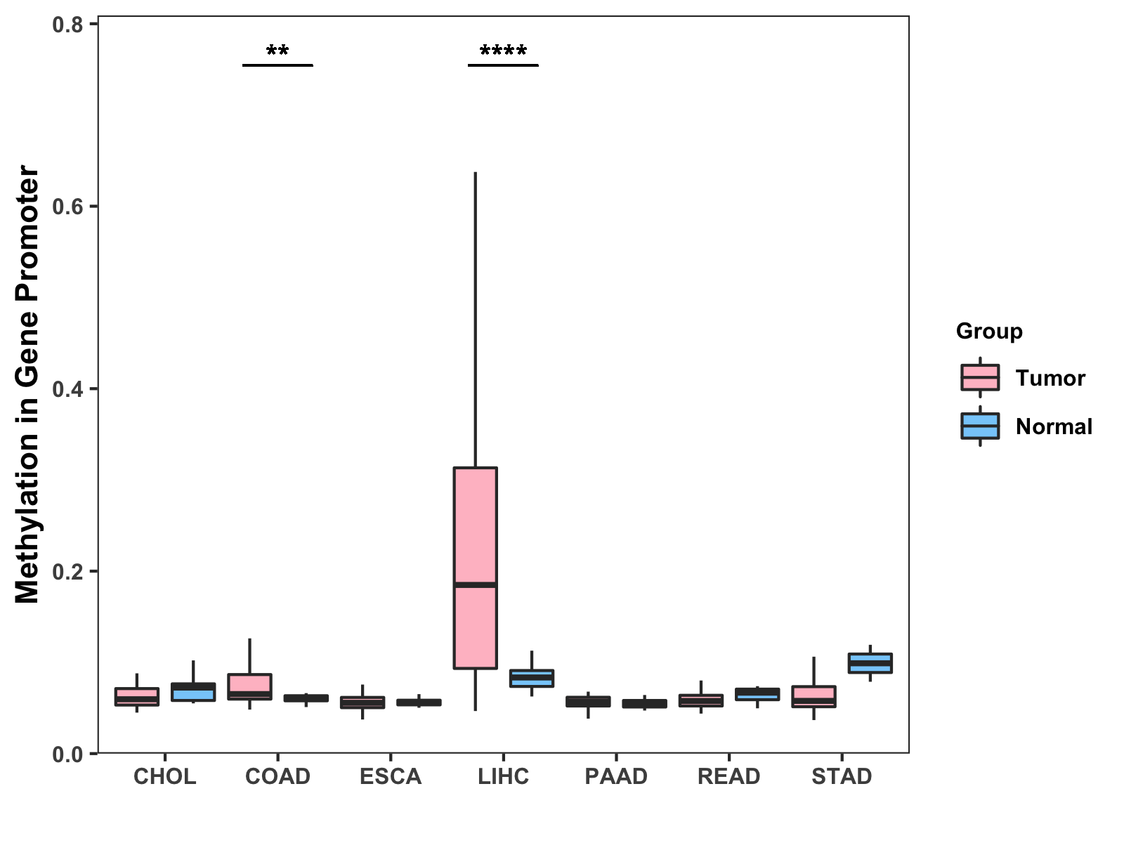 Boxplot of All Gastrointestinal Cancer ( * : 0.01-0.05 , ** : 0.005-0.01 , *** : 0.0001-0.005 , **** : < 0.0001 ) |