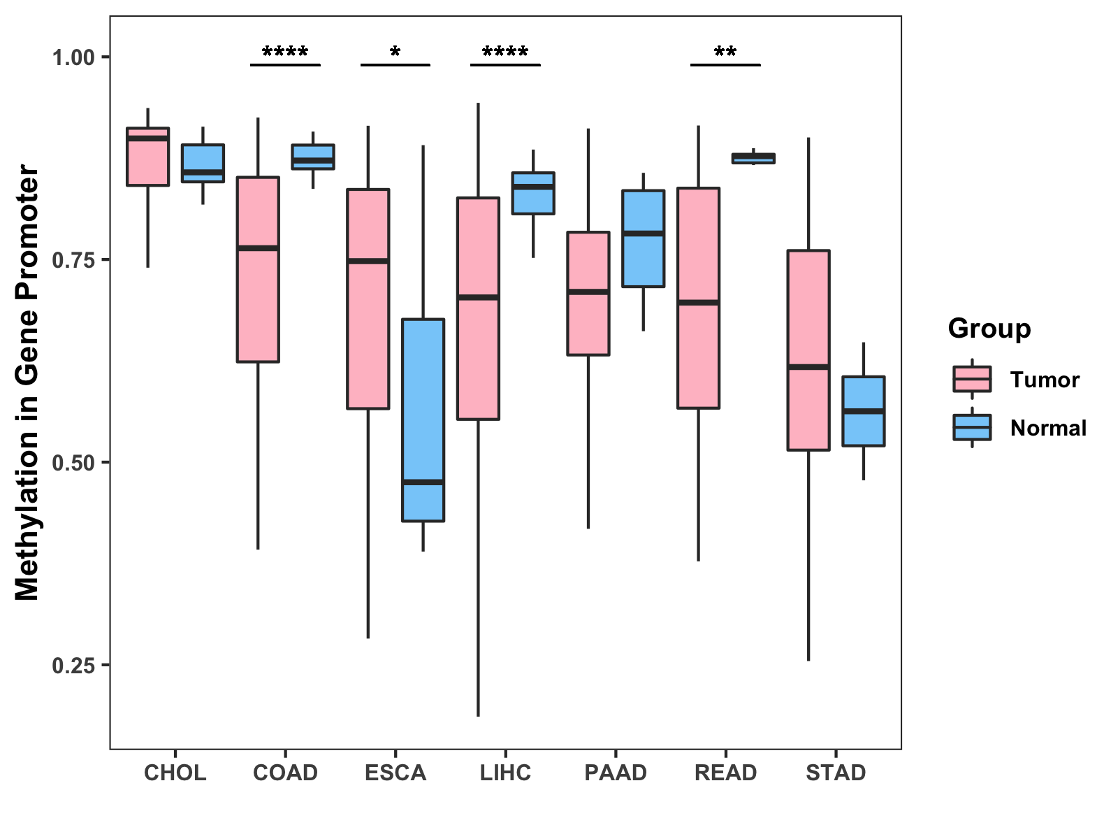 Boxplot of All Gastrointestinal Cancer ( * : 0.01-0.05 , ** : 0.005-0.01 , *** : 0.0001-0.005 , **** : < 0.0001 ) |