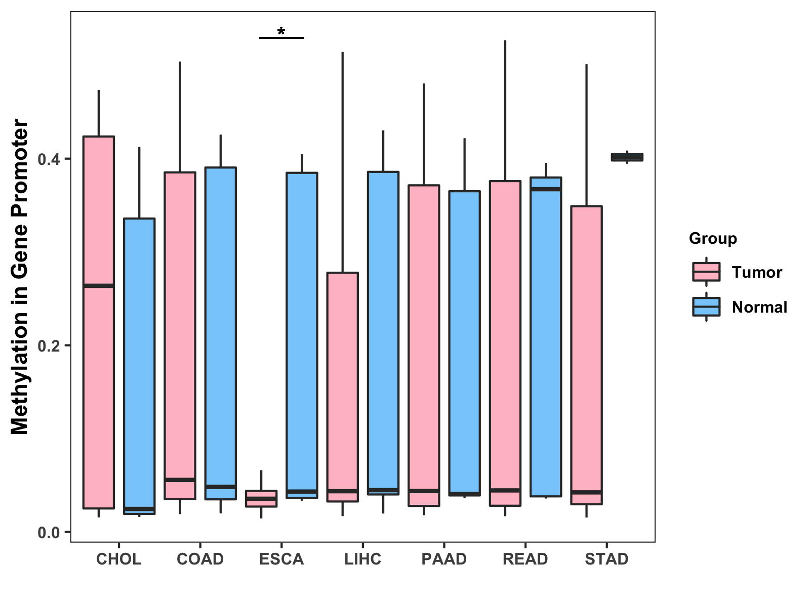 Boxplot of All Gastrointestinal Cancer ( * : 0.01-0.05 , ** : 0.005-0.01 , *** : 0.0001-0.005 , **** : < 0.0001 ) |
