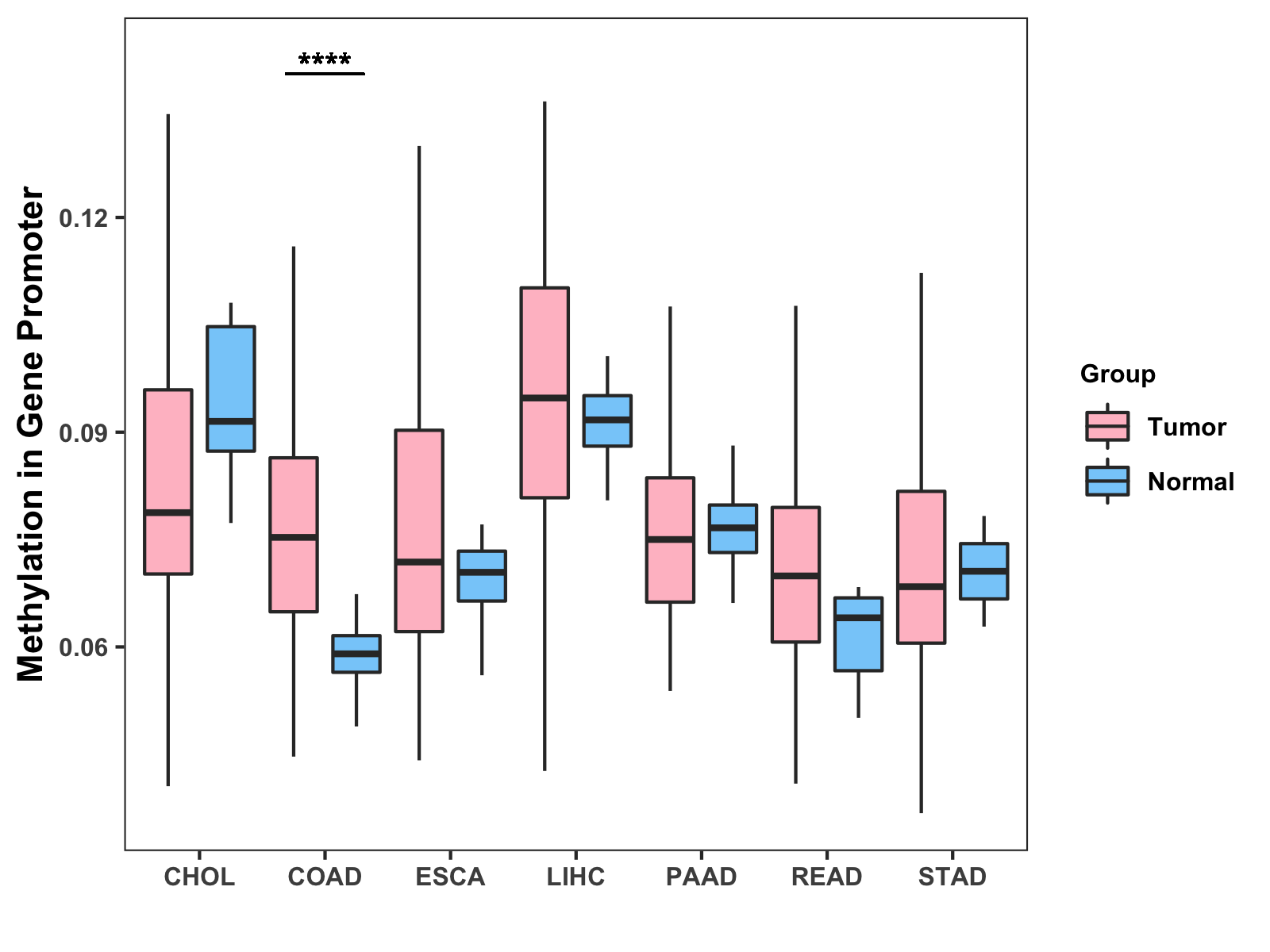Boxplot of All Gastrointestinal Cancer ( * : 0.01-0.05 , ** : 0.005-0.01 , *** : 0.0001-0.005 , **** : < 0.0001 ) |