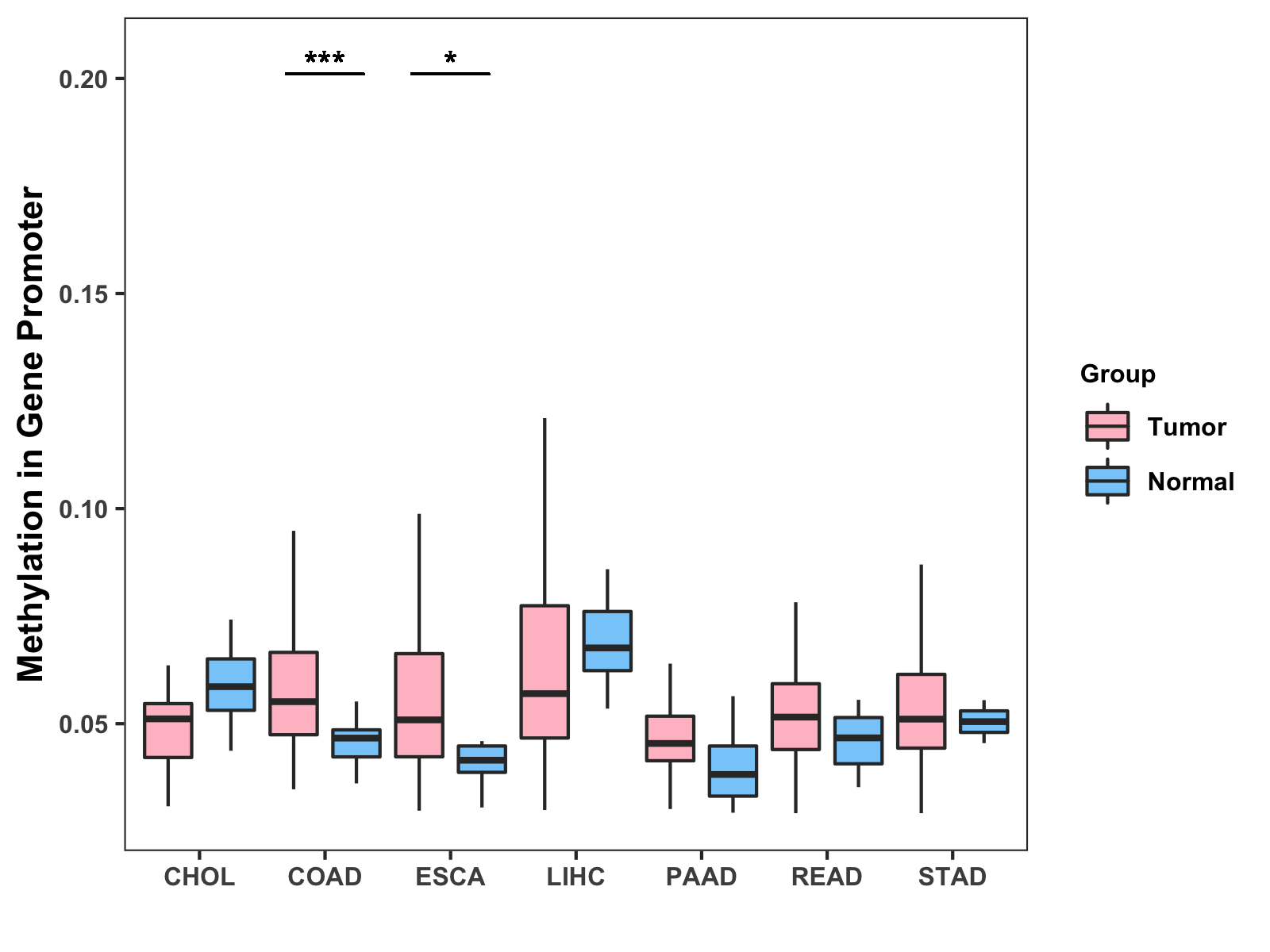 Boxplot of All Gastrointestinal Cancer ( * : 0.01-0.05 , ** : 0.005-0.01 , *** : 0.0001-0.005 , **** : < 0.0001 ) |
