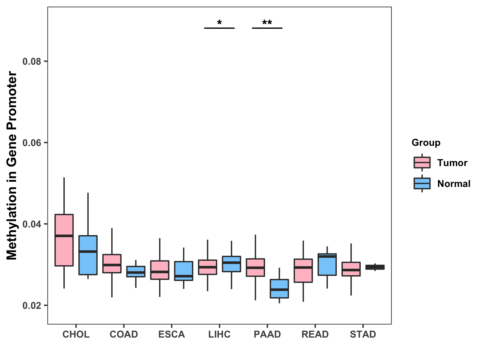 Boxplot of All Gastrointestinal Cancer ( * : 0.01-0.05 , ** : 0.005-0.01 , *** : 0.0001-0.005 , **** : < 0.0001 ) |
