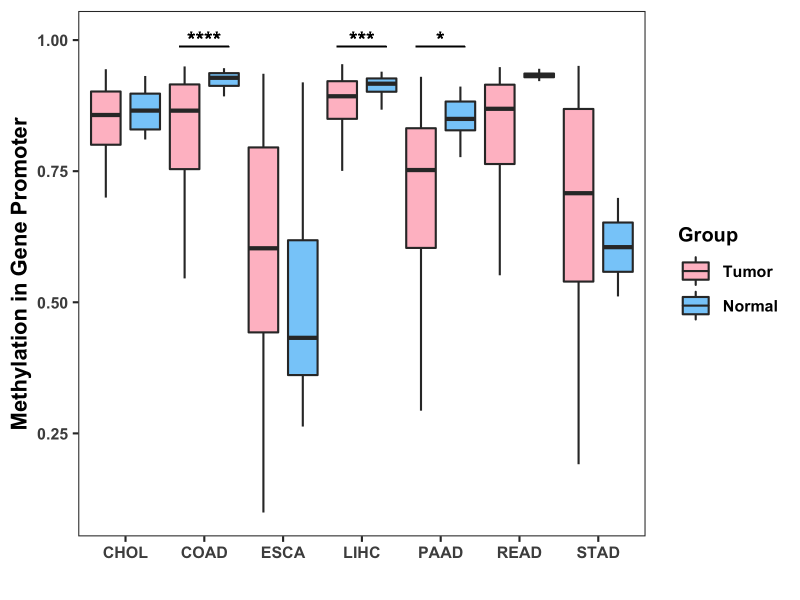 Boxplot of All Gastrointestinal Cancer ( * : 0.01-0.05 , ** : 0.005-0.01 , *** : 0.0001-0.005 , **** : < 0.0001 ) |
