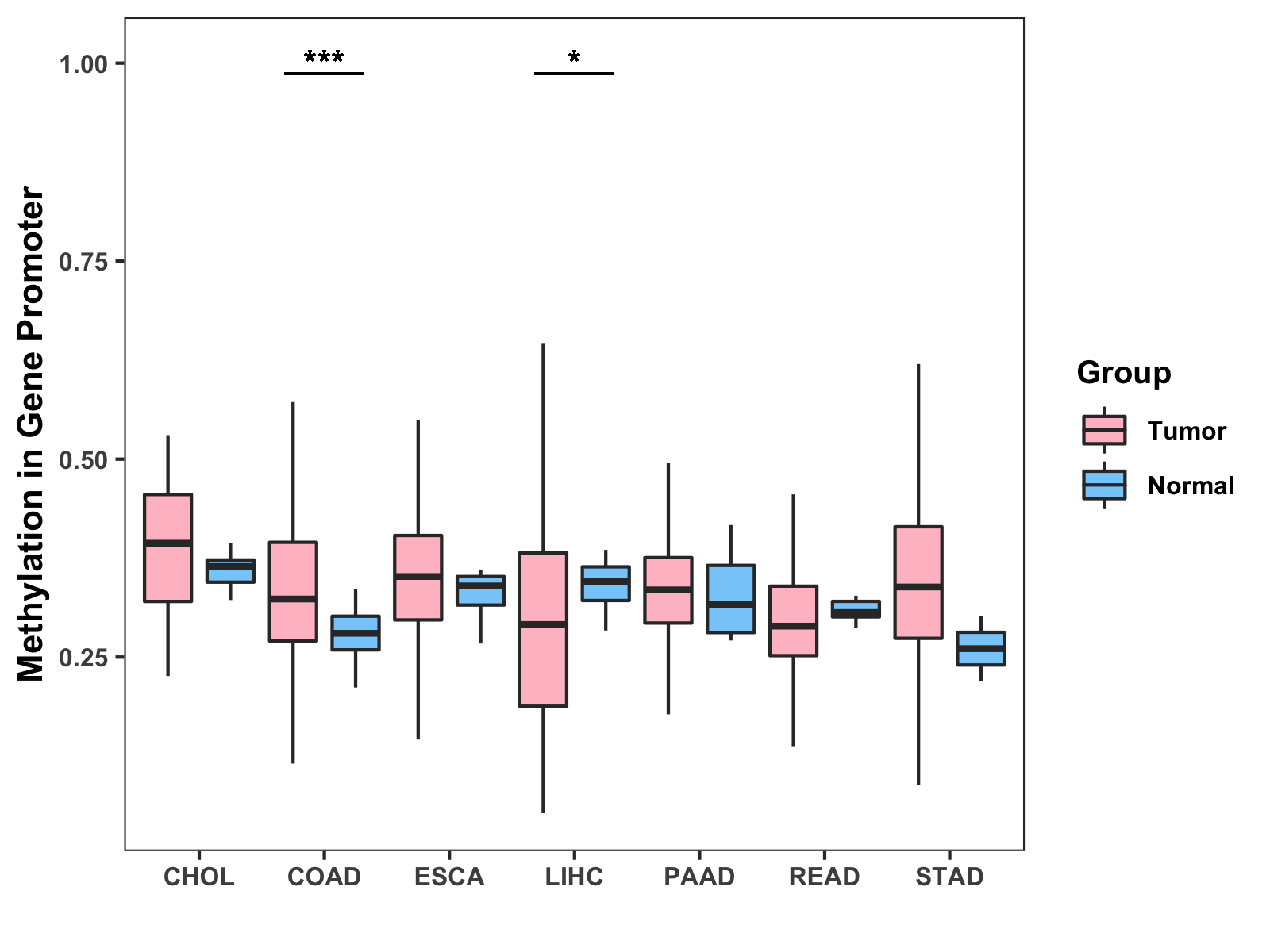 Boxplot of All Gastrointestinal Cancer ( * : 0.01-0.05 , ** : 0.005-0.01 , *** : 0.0001-0.005 , **** : < 0.0001 ) |