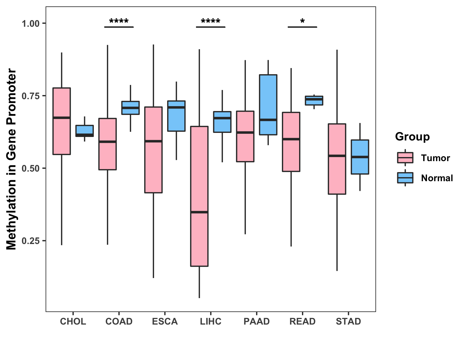 Boxplot of All Gastrointestinal Cancer ( * : 0.01-0.05 , ** : 0.005-0.01 , *** : 0.0001-0.005 , **** : < 0.0001 ) |
