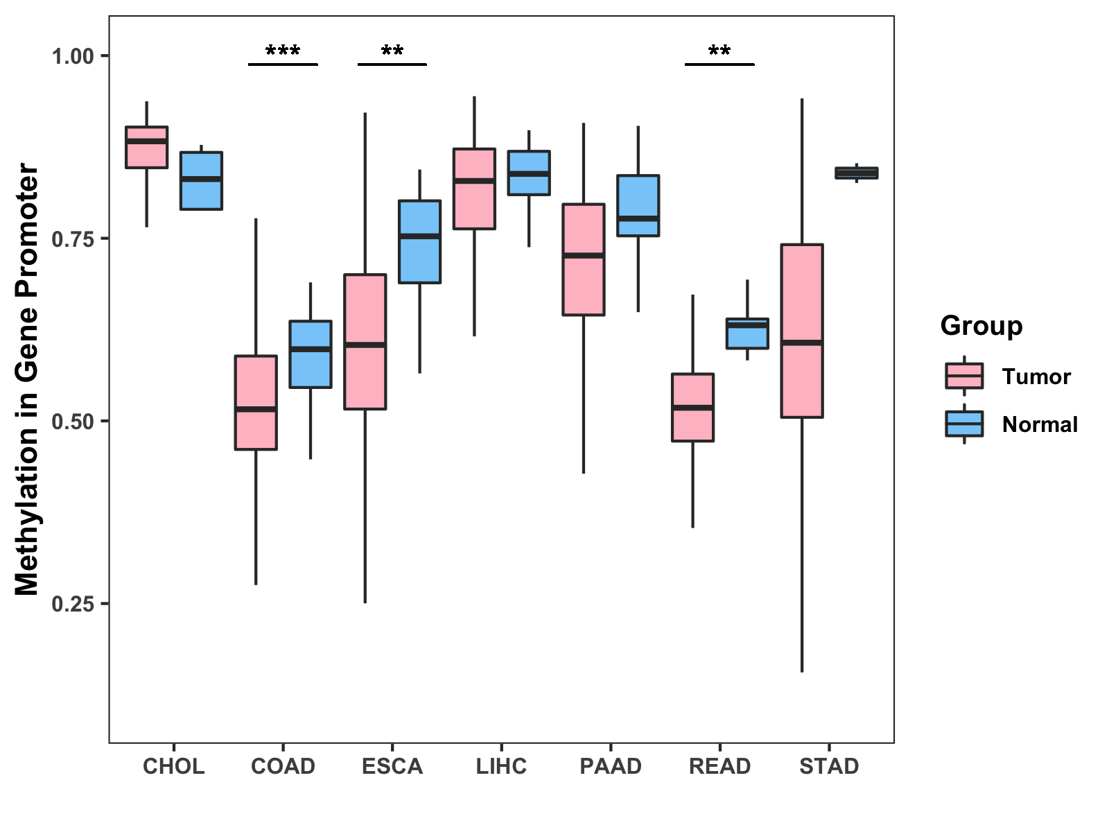 Boxplot of All Gastrointestinal Cancer ( * : 0.01-0.05 , ** : 0.005-0.01 , *** : 0.0001-0.005 , **** : < 0.0001 ) |