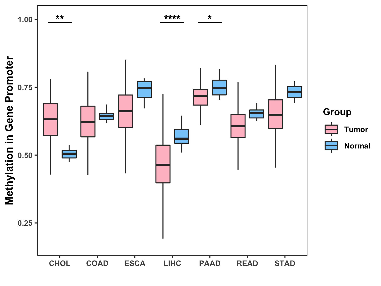 Boxplot of All Gastrointestinal Cancer ( * : 0.01-0.05 , ** : 0.005-0.01 , *** : 0.0001-0.005 , **** : < 0.0001 ) |
