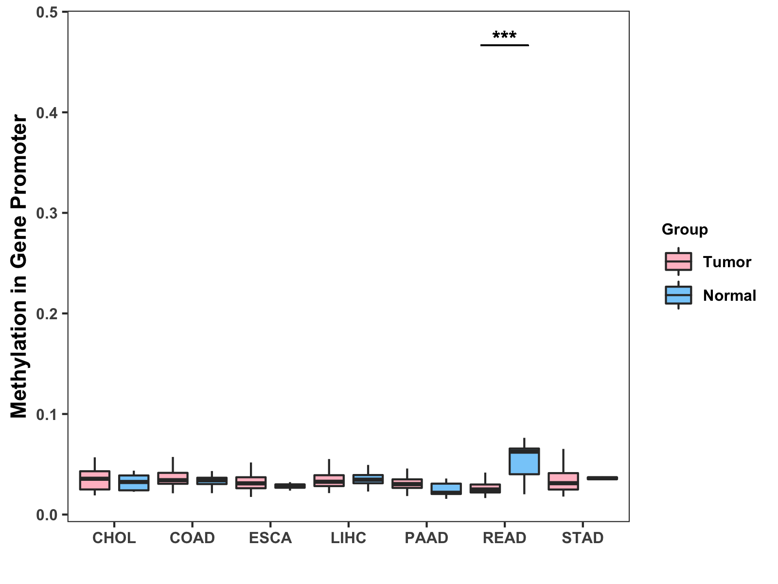Boxplot of All Gastrointestinal Cancer ( * : 0.01-0.05 , ** : 0.005-0.01 , *** : 0.0001-0.005 , **** : < 0.0001 ) |