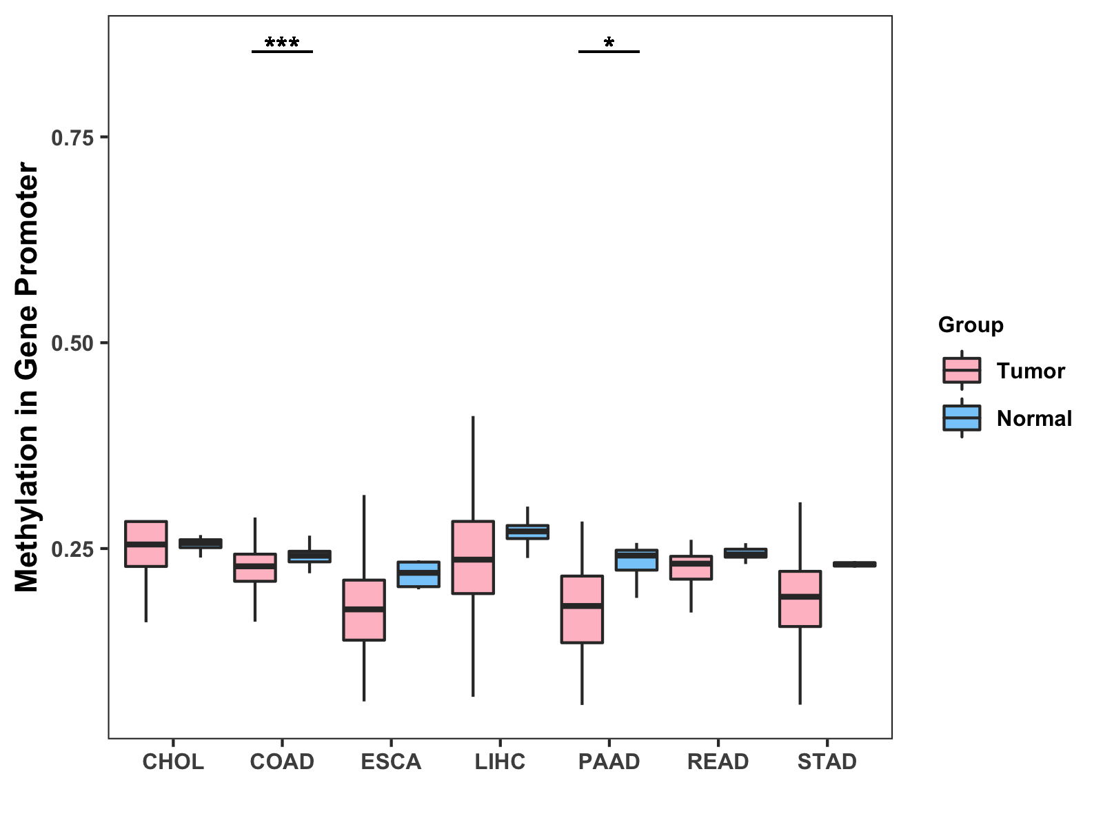 Boxplot of All Gastrointestinal Cancer ( * : 0.01-0.05 , ** : 0.005-0.01 , *** : 0.0001-0.005 , **** : < 0.0001 ) |
