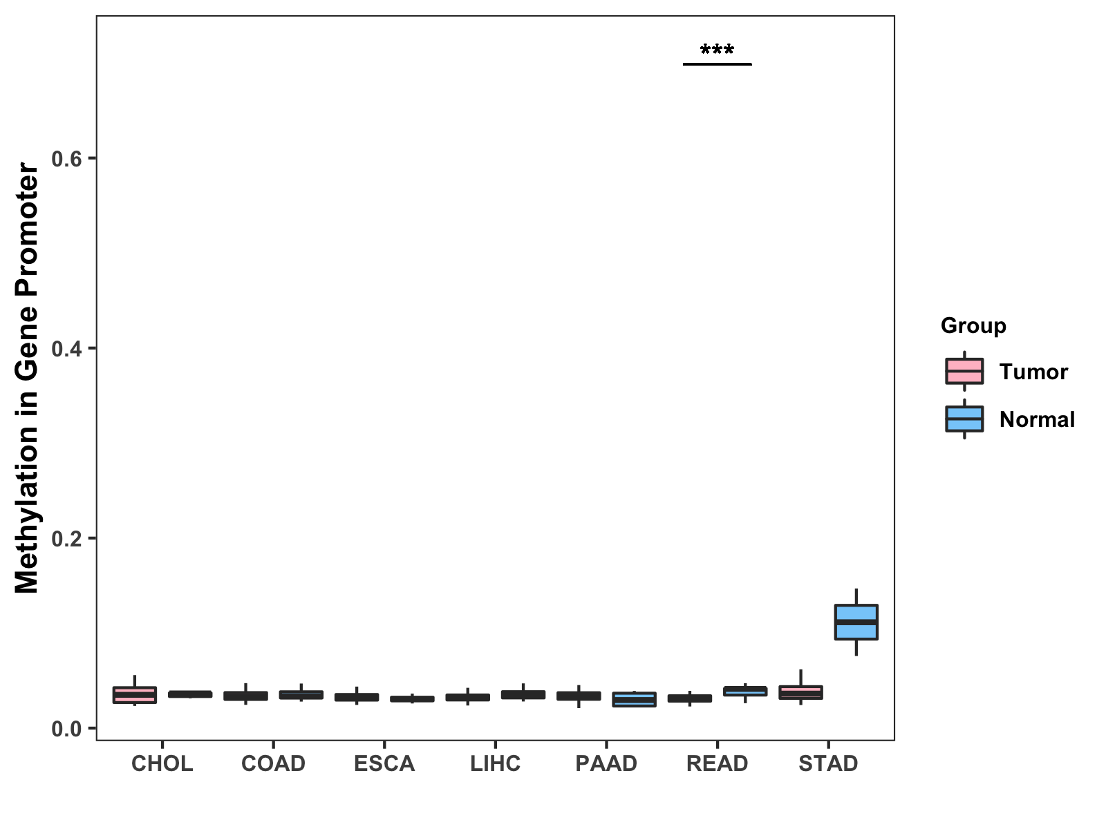 Boxplot of All Gastrointestinal Cancer ( * : 0.01-0.05 , ** : 0.005-0.01 , *** : 0.0001-0.005 , **** : < 0.0001 ) |