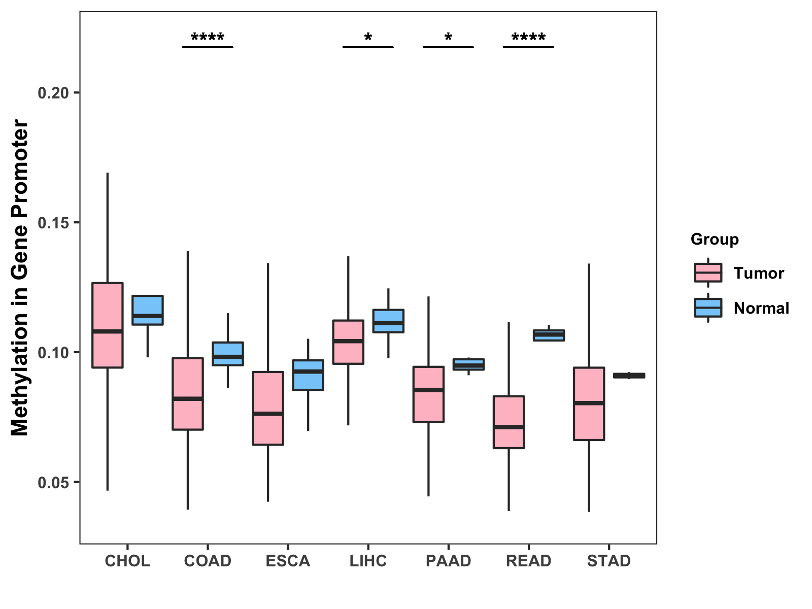 Boxplot of All Gastrointestinal Cancer ( * : 0.01-0.05 , ** : 0.005-0.01 , *** : 0.0001-0.005 , **** : < 0.0001 ) |