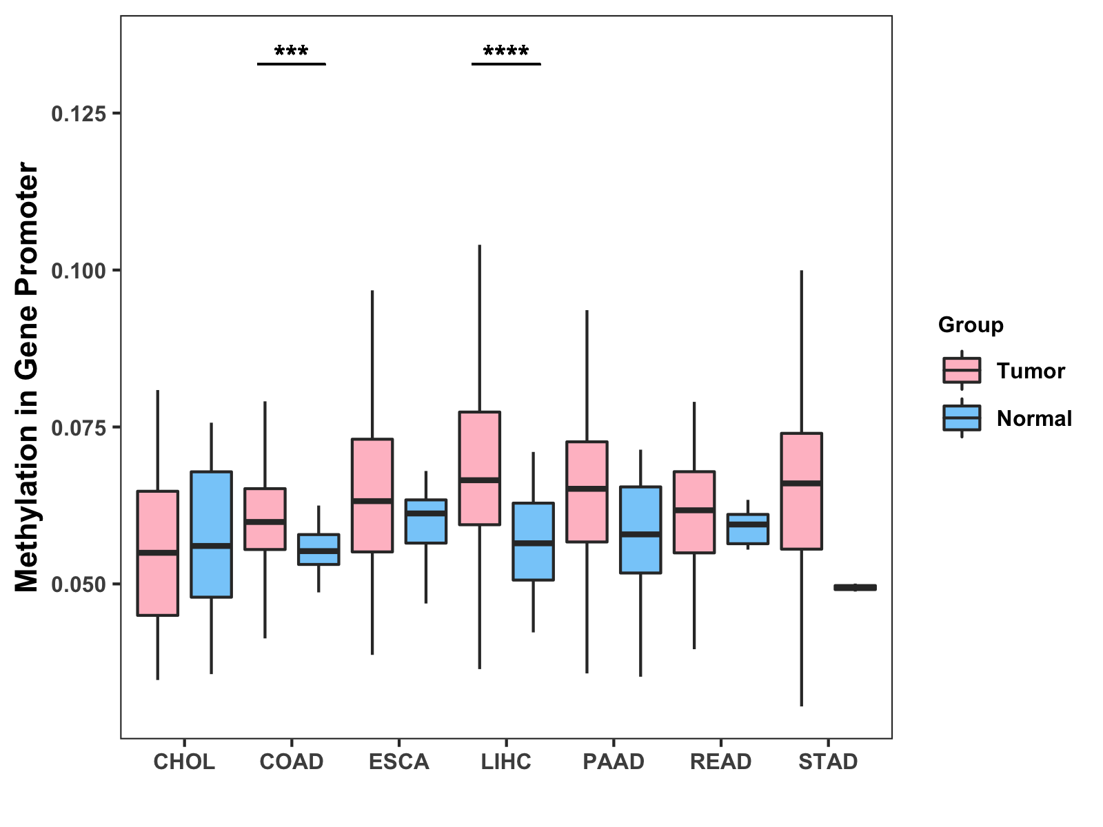 Boxplot of All Gastrointestinal Cancer ( * : 0.01-0.05 , ** : 0.005-0.01 , *** : 0.0001-0.005 , **** : < 0.0001 ) |