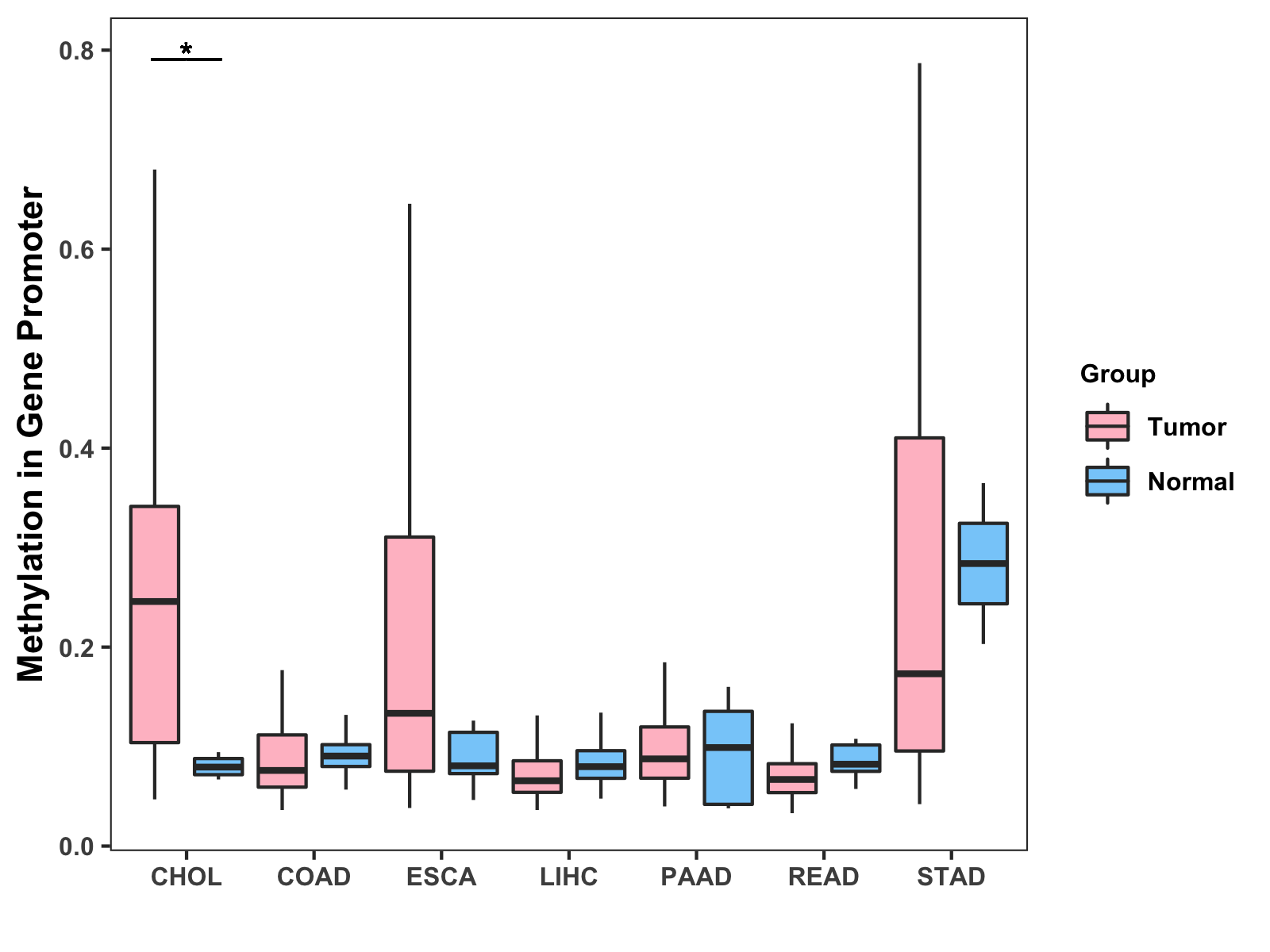Boxplot of All Gastrointestinal Cancer ( * : 0.01-0.05 , ** : 0.005-0.01 , *** : 0.0001-0.005 , **** : < 0.0001 ) |